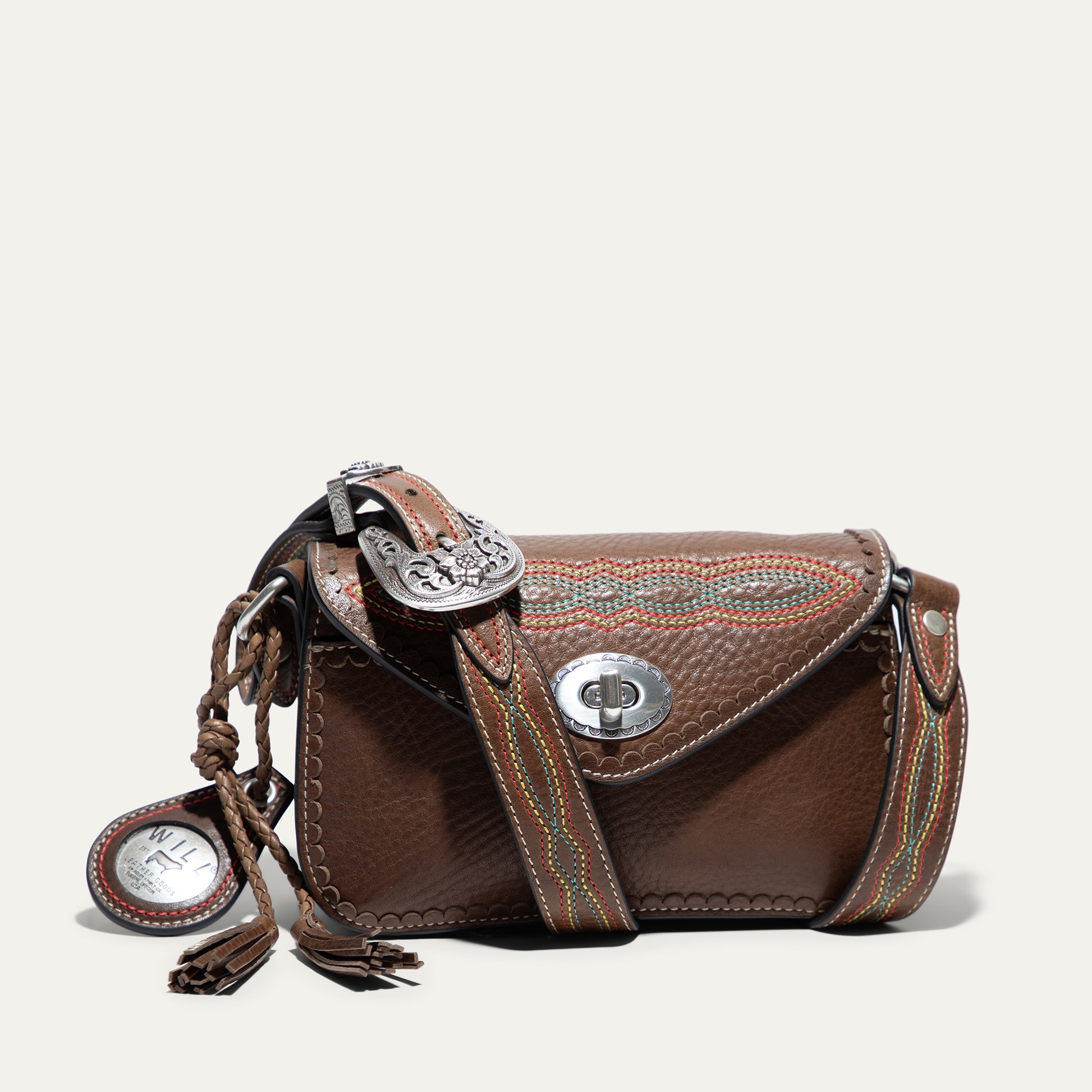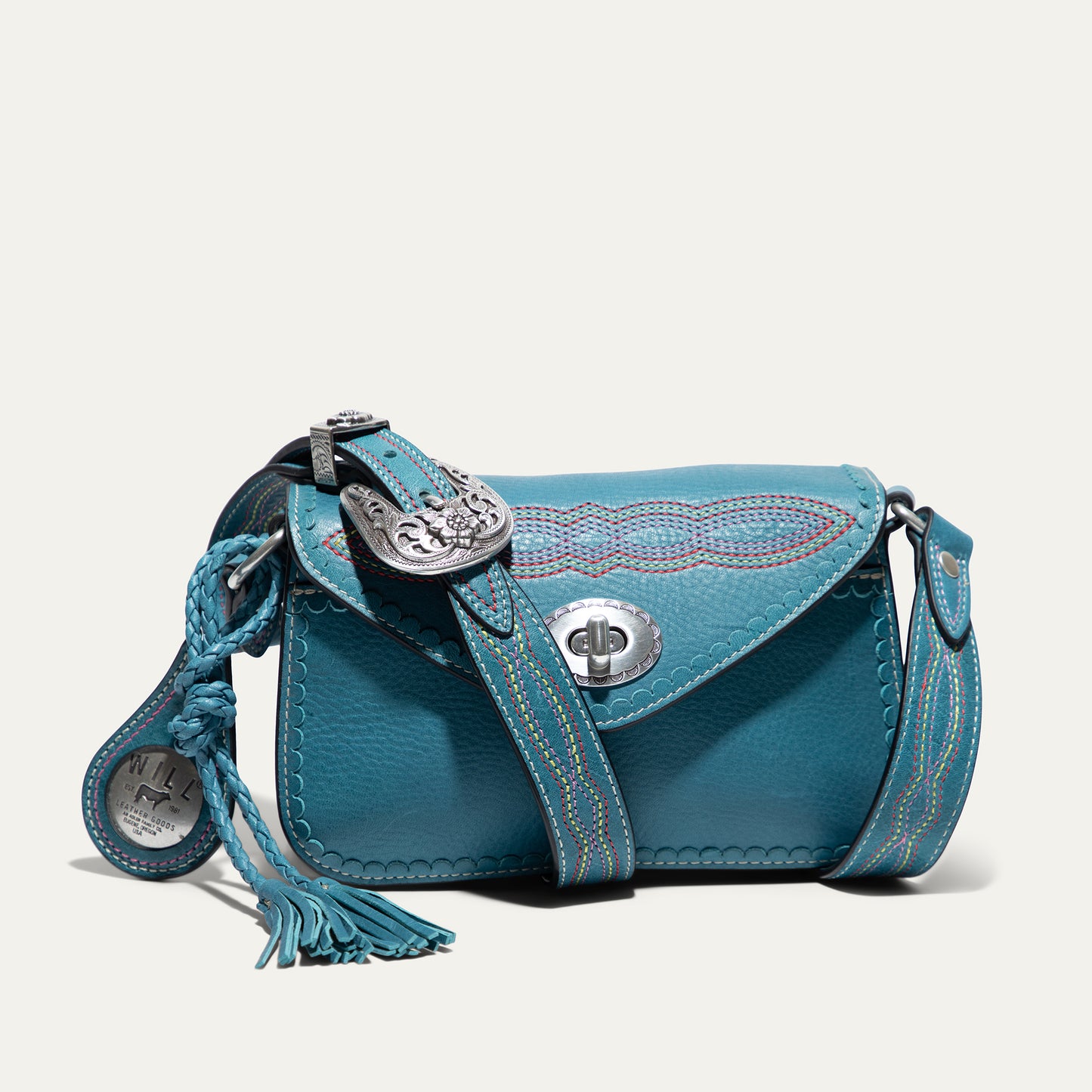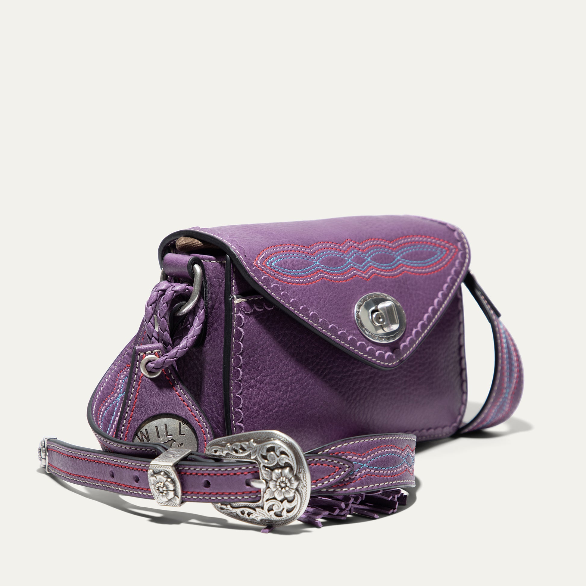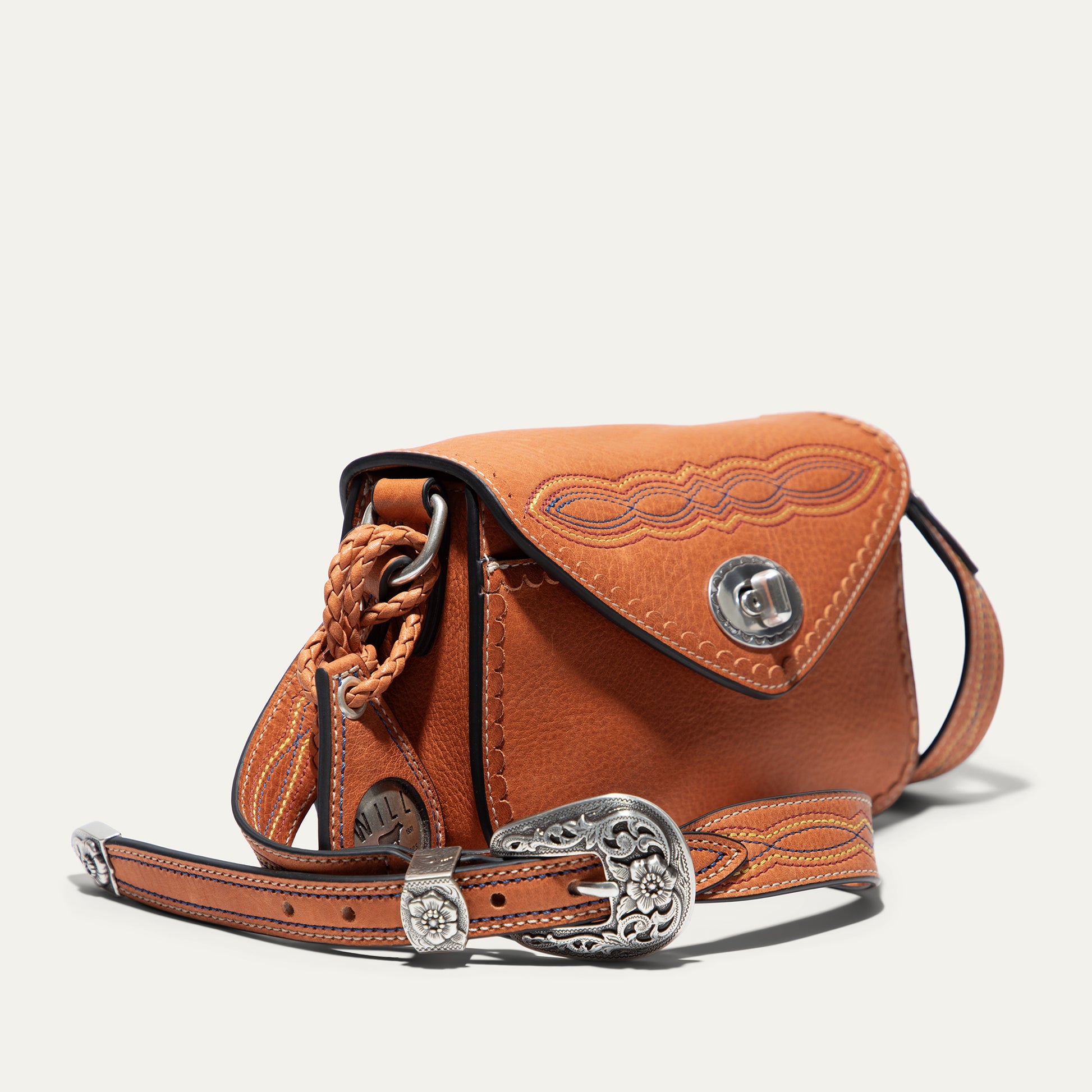 The Abilene Mini Crossbody is handcrafted from full-grain, vegetable-tanned leather. Adorned with colorful cowboy boot stitching, the flap features an antique sterling silver finish concho-inspired turn-lock for secure closure. An adjustable boot-stitched leather strap adjusts with a western three-piece buckle set to fit comfortably on the shoulder or across the body. Scalloped leather trim adds an artisanal touch. A hand-braided leather strap with tassels and our leather-framed WILL medallion adds a decorative detail. Under the flap, the exterior has a slip pocket for easy and fast access to your essentials. The lined interior contains six credit card slots. Our artisans use industrial-grade, heavy-gauge nylon thread and steel rivets to ensure durability. We stand behind our product—guaranteed for life.