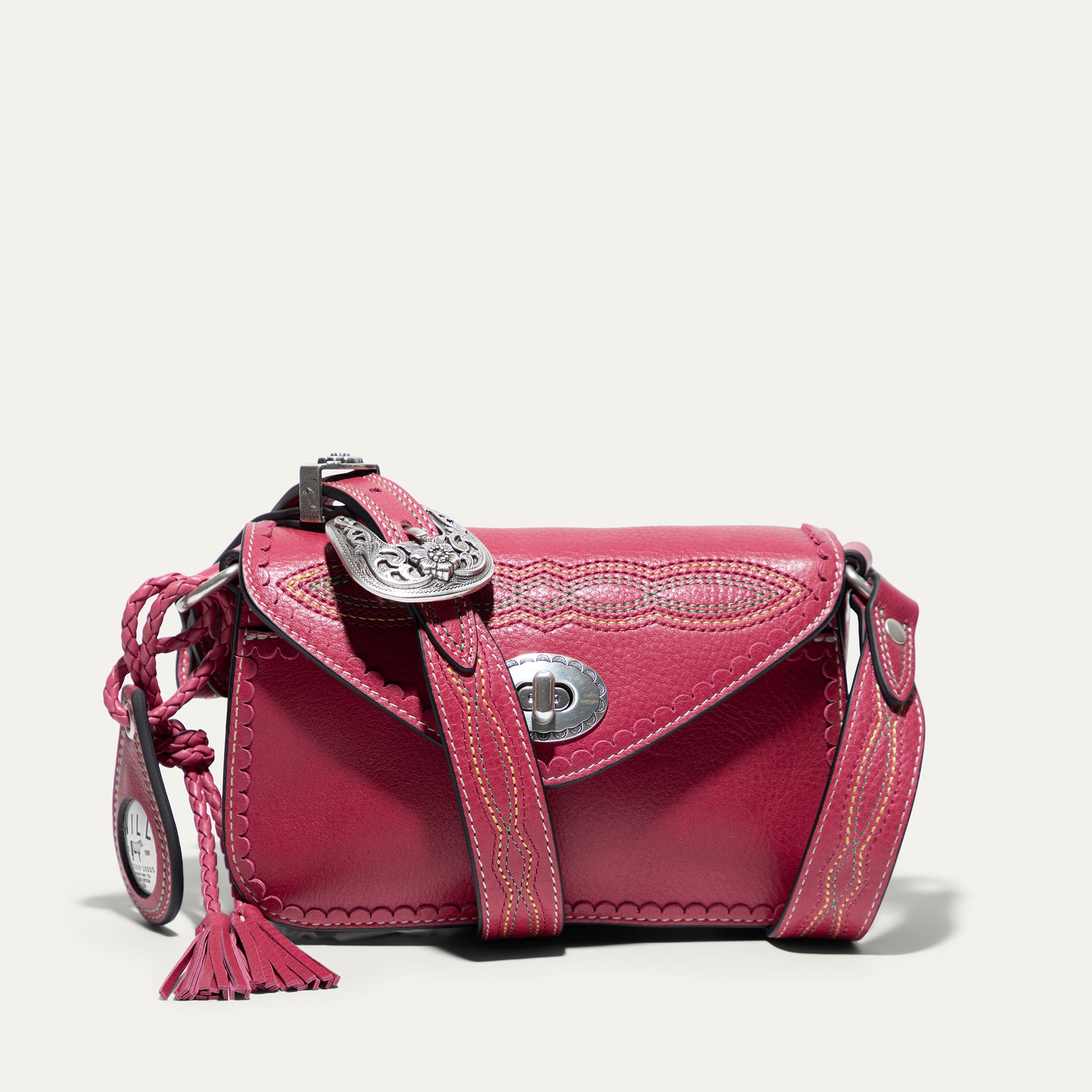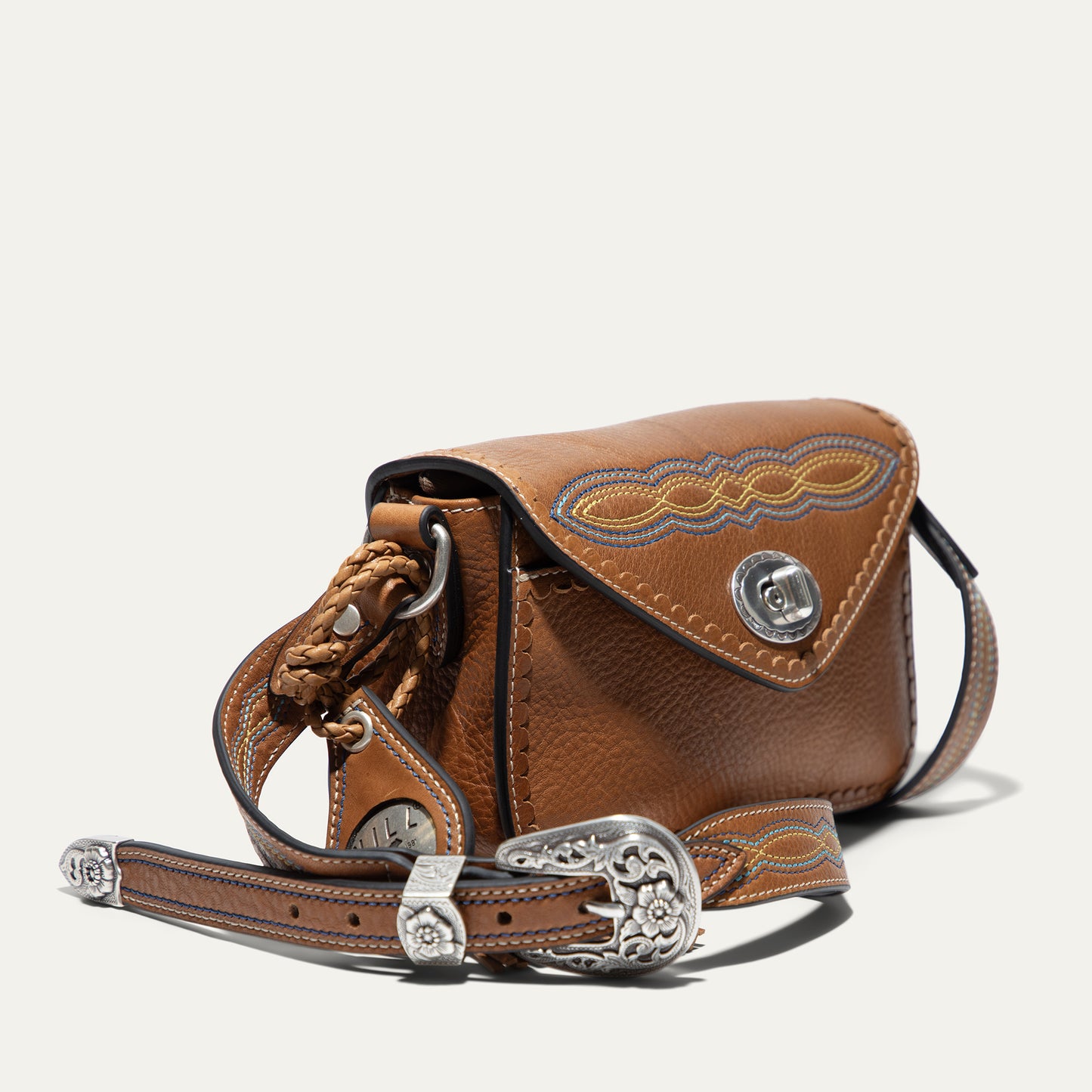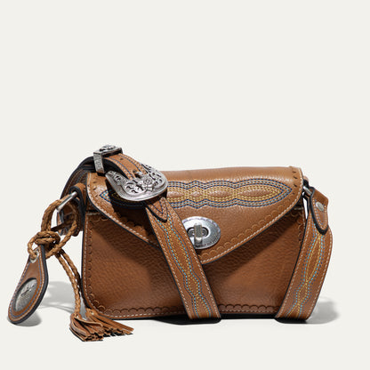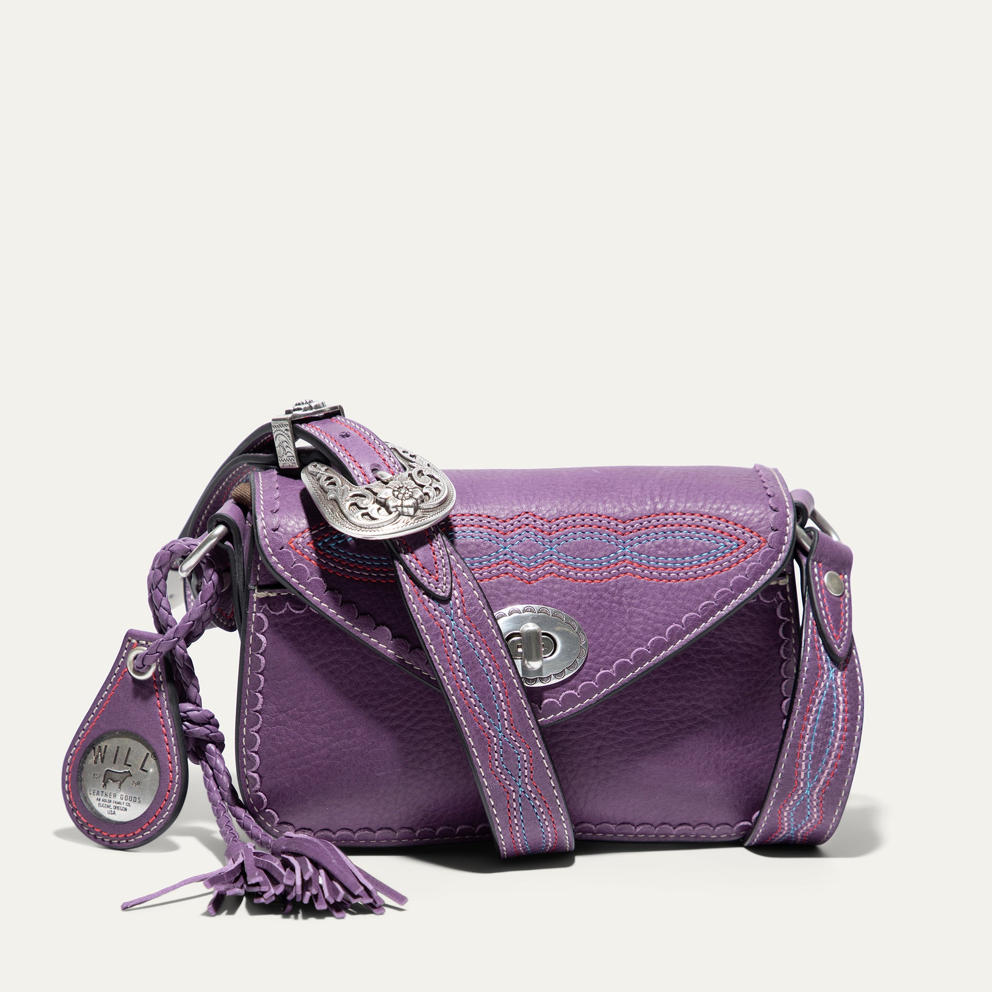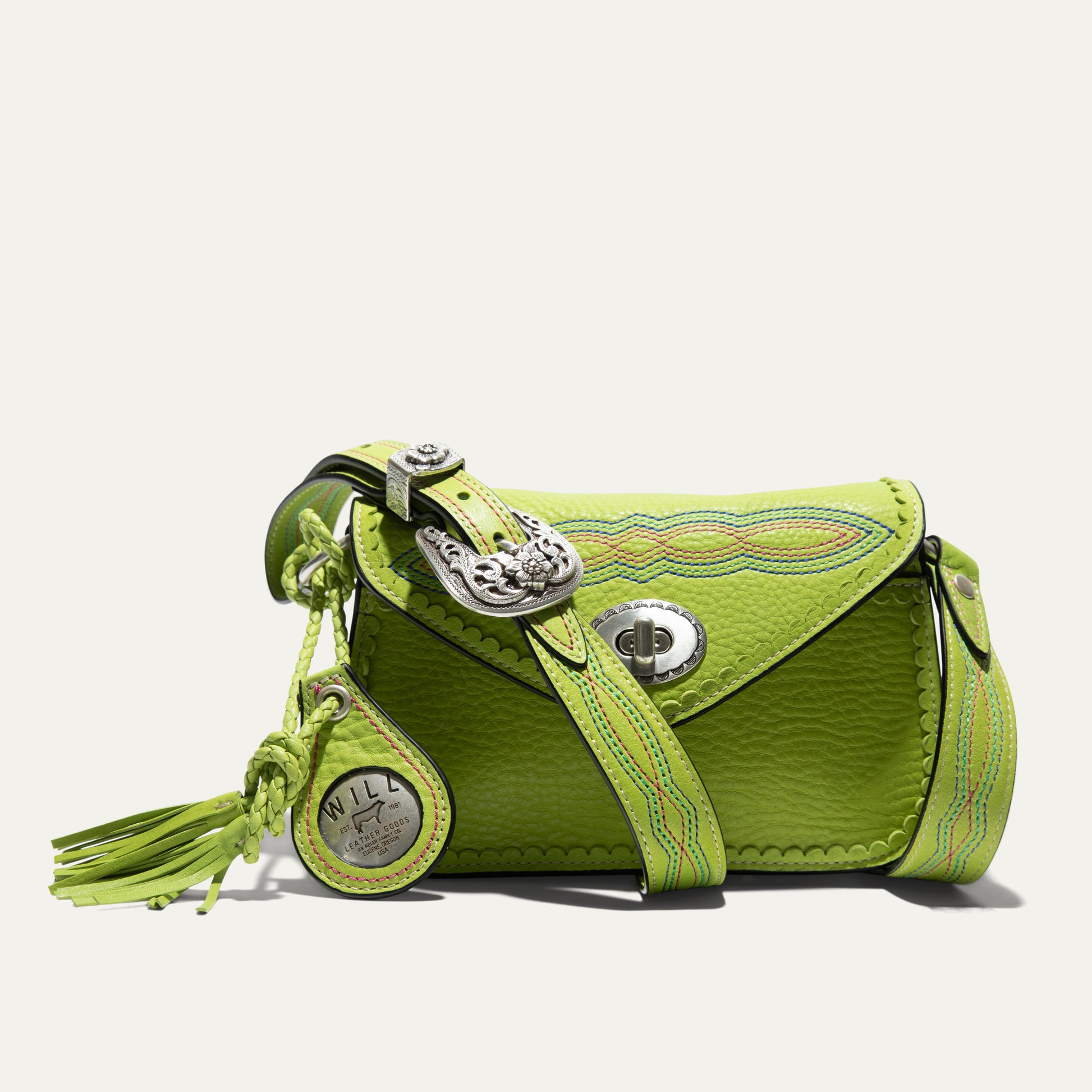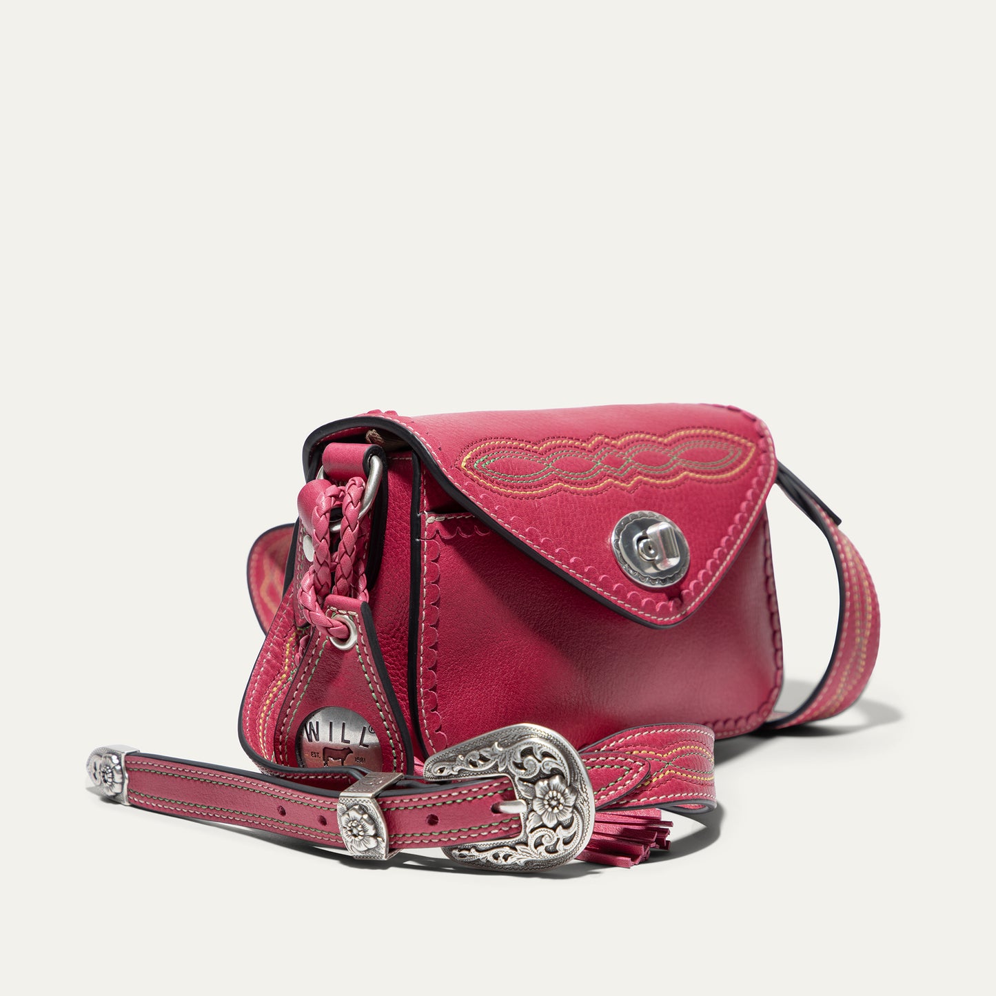 The Abilene Mini Crossbody is handcrafted from full-grain, vegetable-tanned leather. Adorned with colorful cowboy boot stitching, the flap features an antique sterling silver finish concho-inspired turn-lock for secure closure. An adjustable boot-stitched leather strap adjusts with a western three-piece buckle set to fit comfortably on the shoulder or across the body. Scalloped leather trim adds an artisanal touch. A hand-braided leather strap with tassels and our leather-framed WILL medallion adds a decorative detail. Under the flap, the exterior has a slip pocket for easy and fast access to your essentials. The lined interior contains six credit card slots. Our artisans use industrial-grade, heavy-gauge nylon thread and steel rivets to ensure durability. We stand behind our product—guaranteed for life.