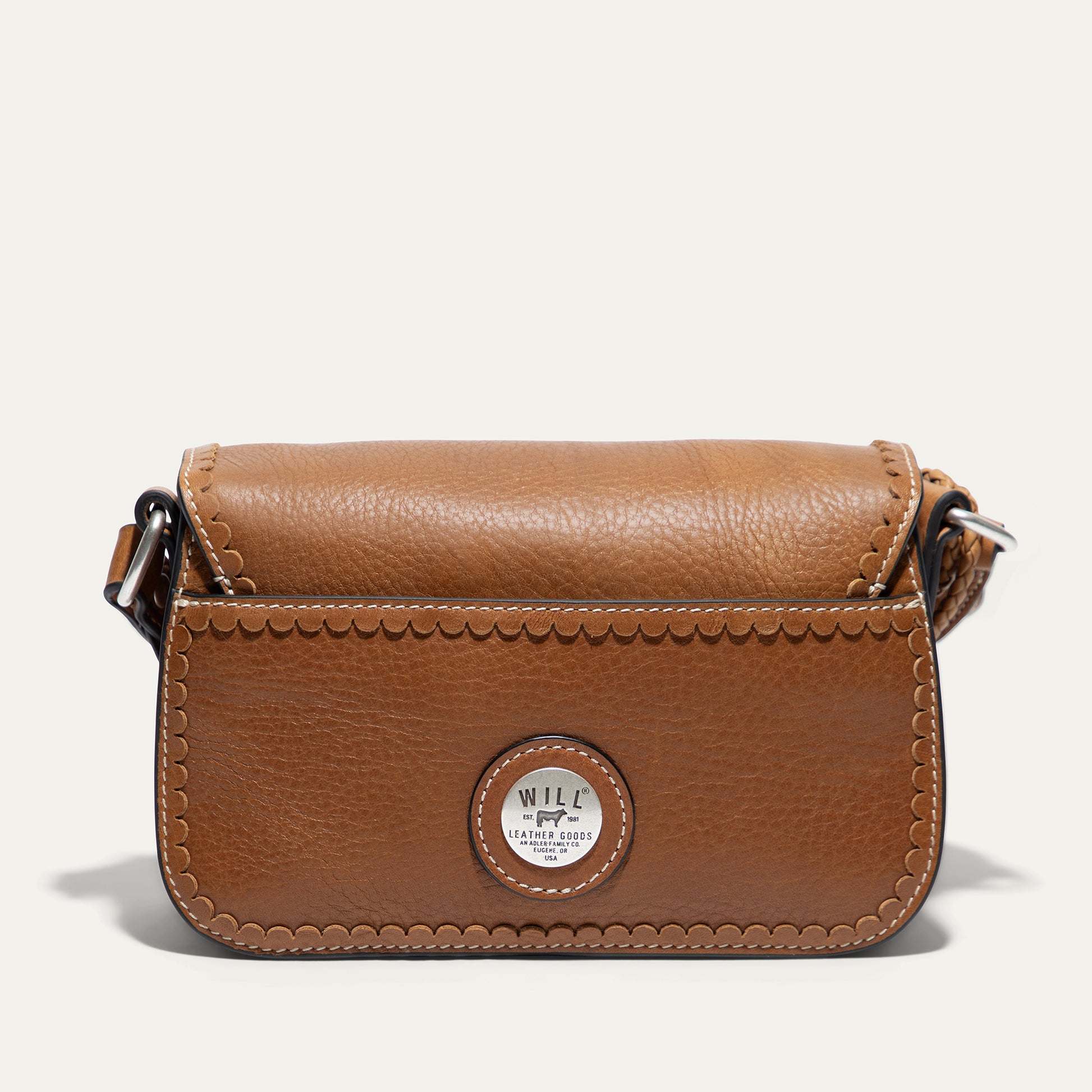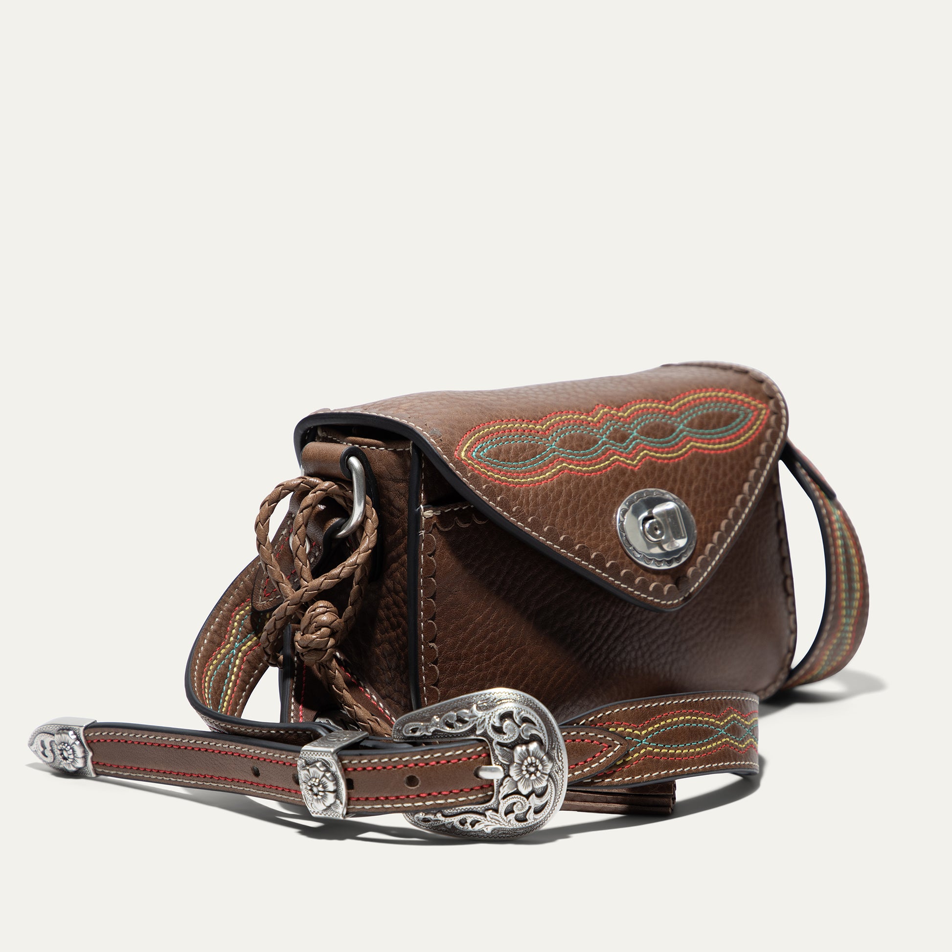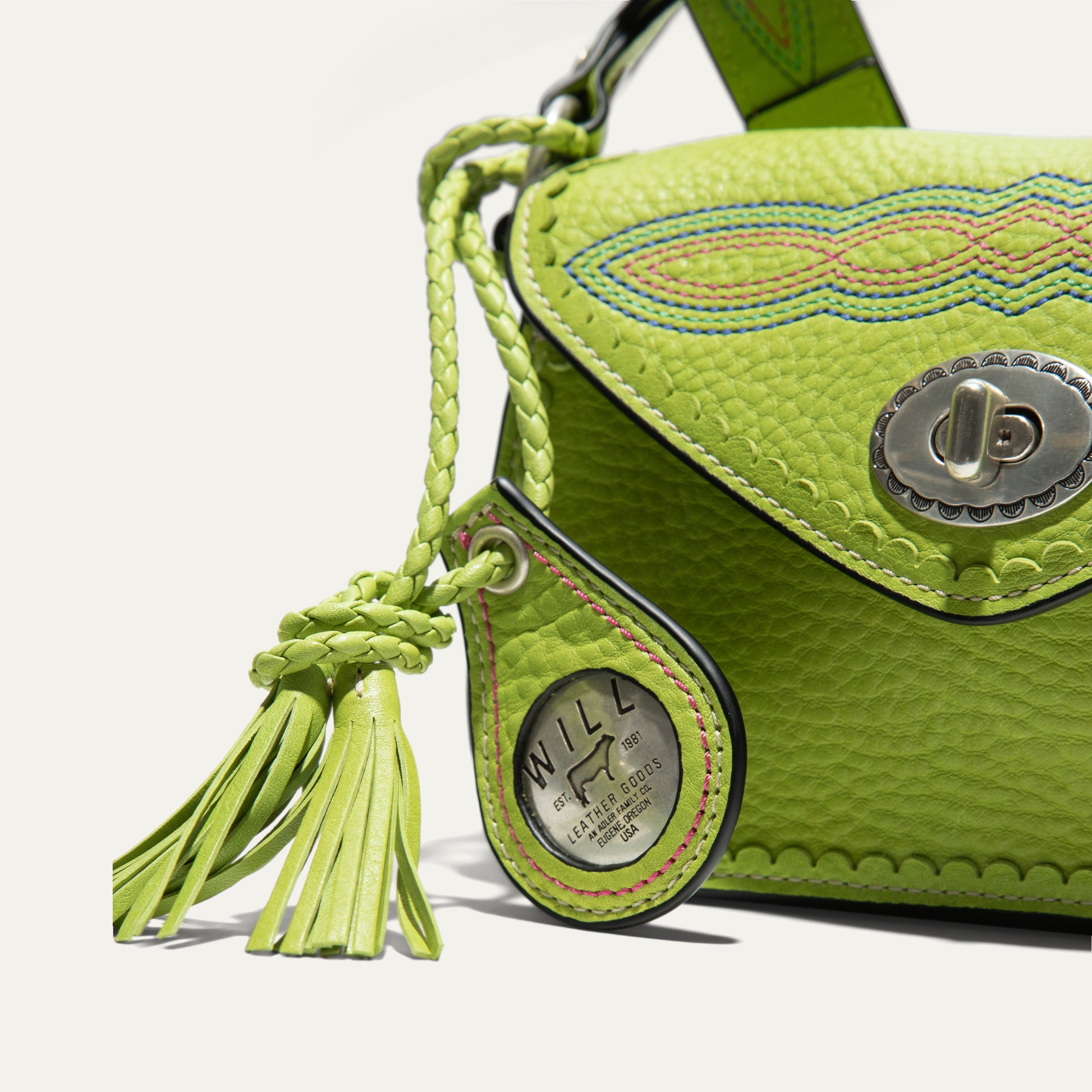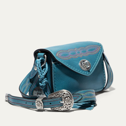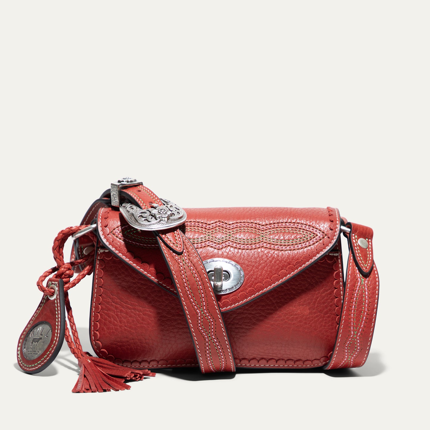 The Abilene Mini Crossbody is handcrafted from full-grain, vegetable-tanned leather. Adorned with colorful cowboy boot stitching, the flap features an antique sterling silver finish concho-inspired turn-lock for secure closure. An adjustable boot-stitched leather strap adjusts with a western three-piece buckle set to fit comfortably on the shoulder or across the body. Scalloped leather trim adds an artisanal touch. A hand-braided leather strap with tassels and our leather-framed WILL medallion adds a decorative detail. Under the flap, the exterior has a slip pocket for easy and fast access to your essentials. The lined interior contains six credit card slots. Our artisans use industrial-grade, heavy-gauge nylon thread and steel rivets to ensure durability. We stand behind our product—guaranteed for life.