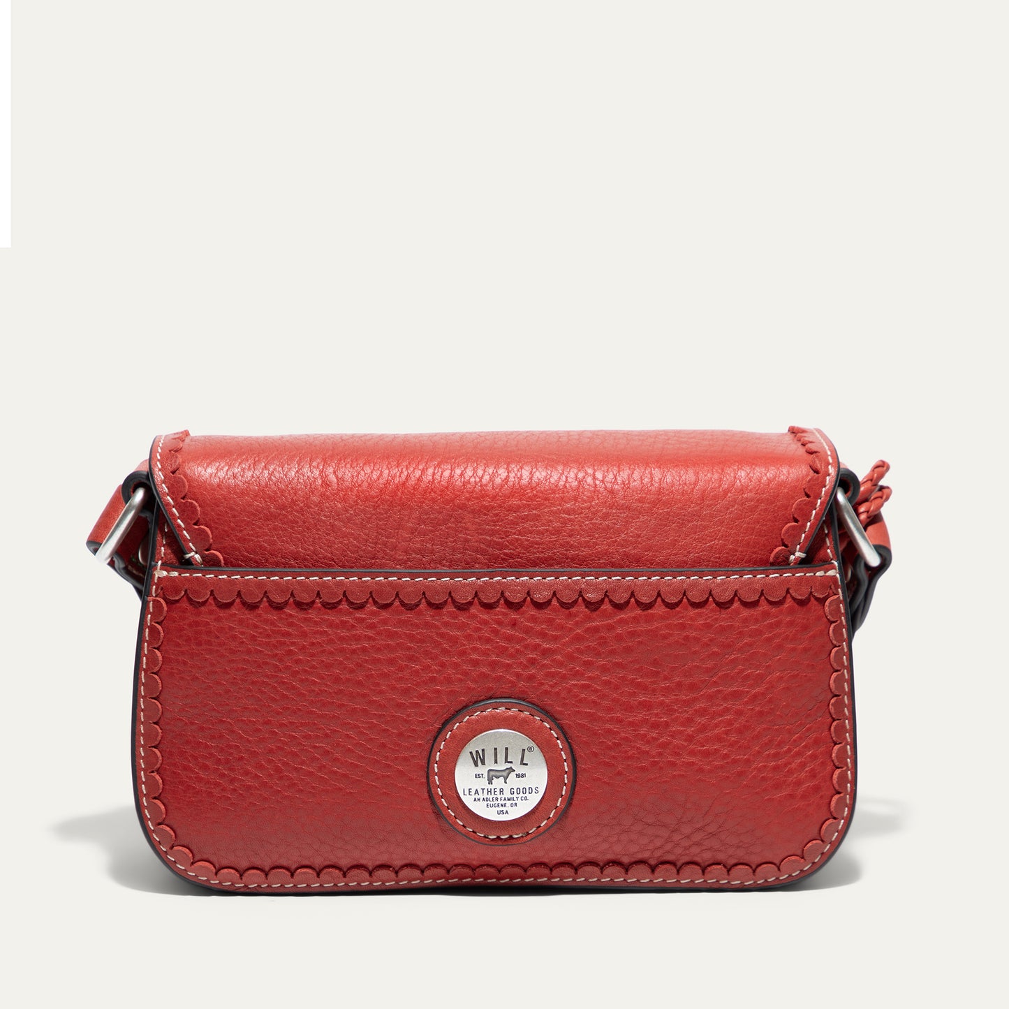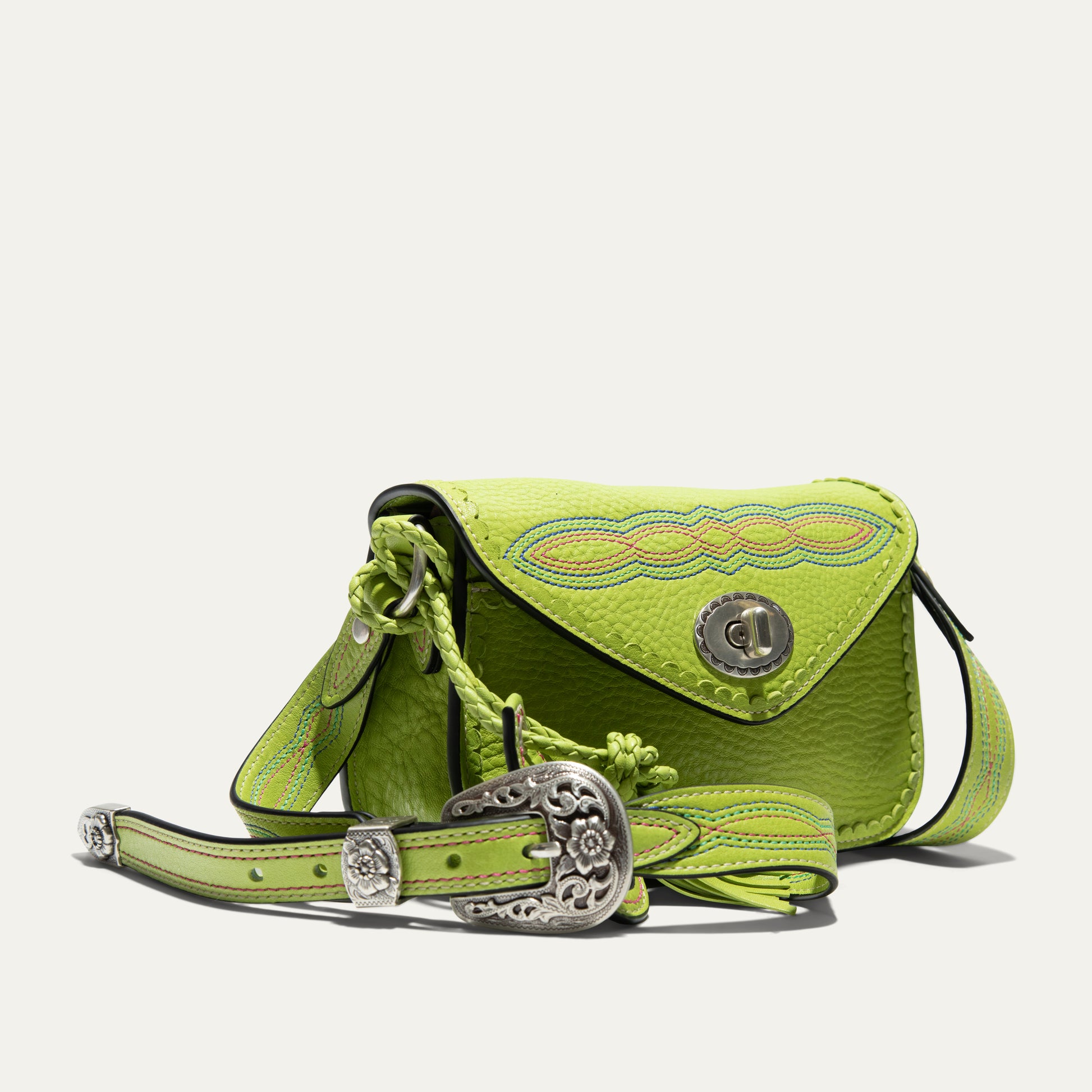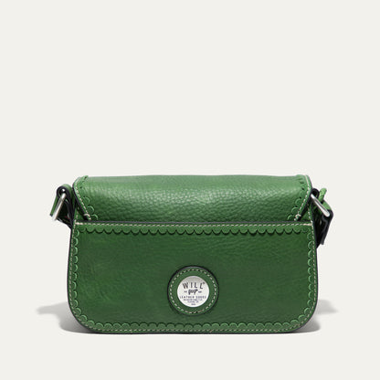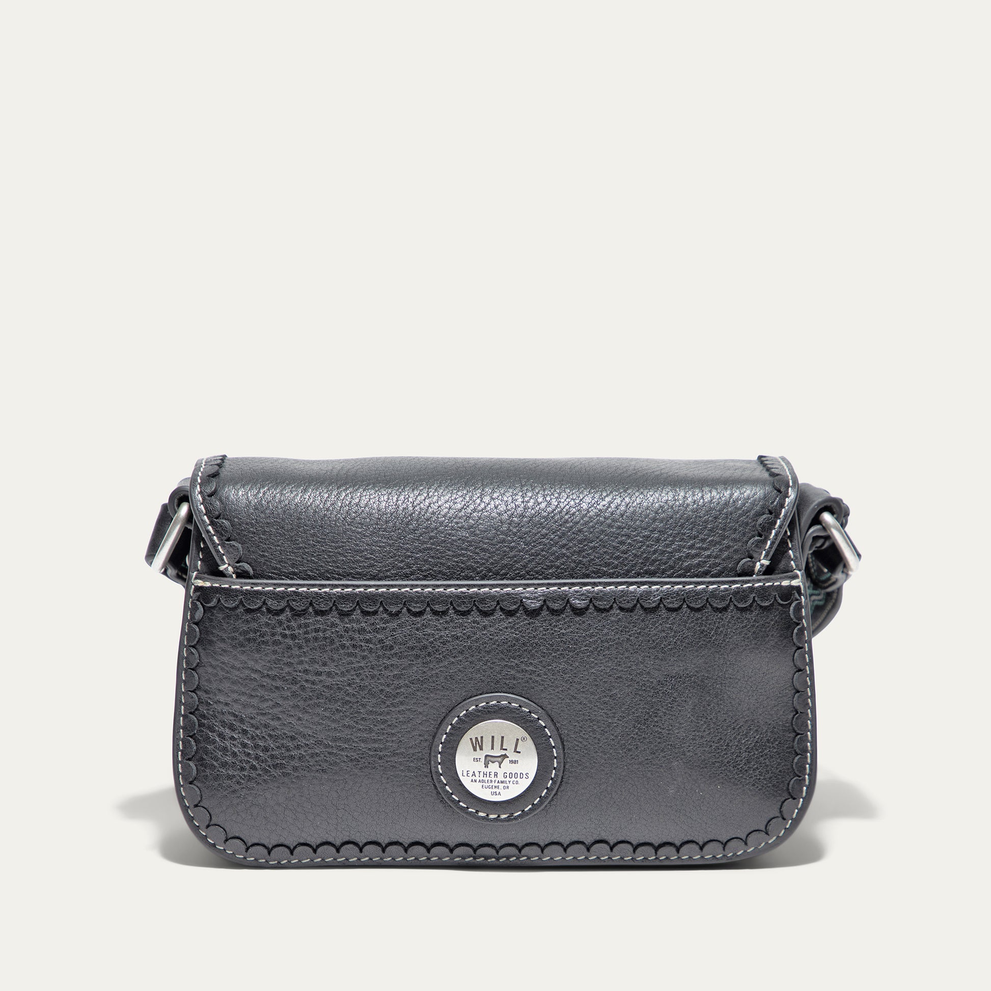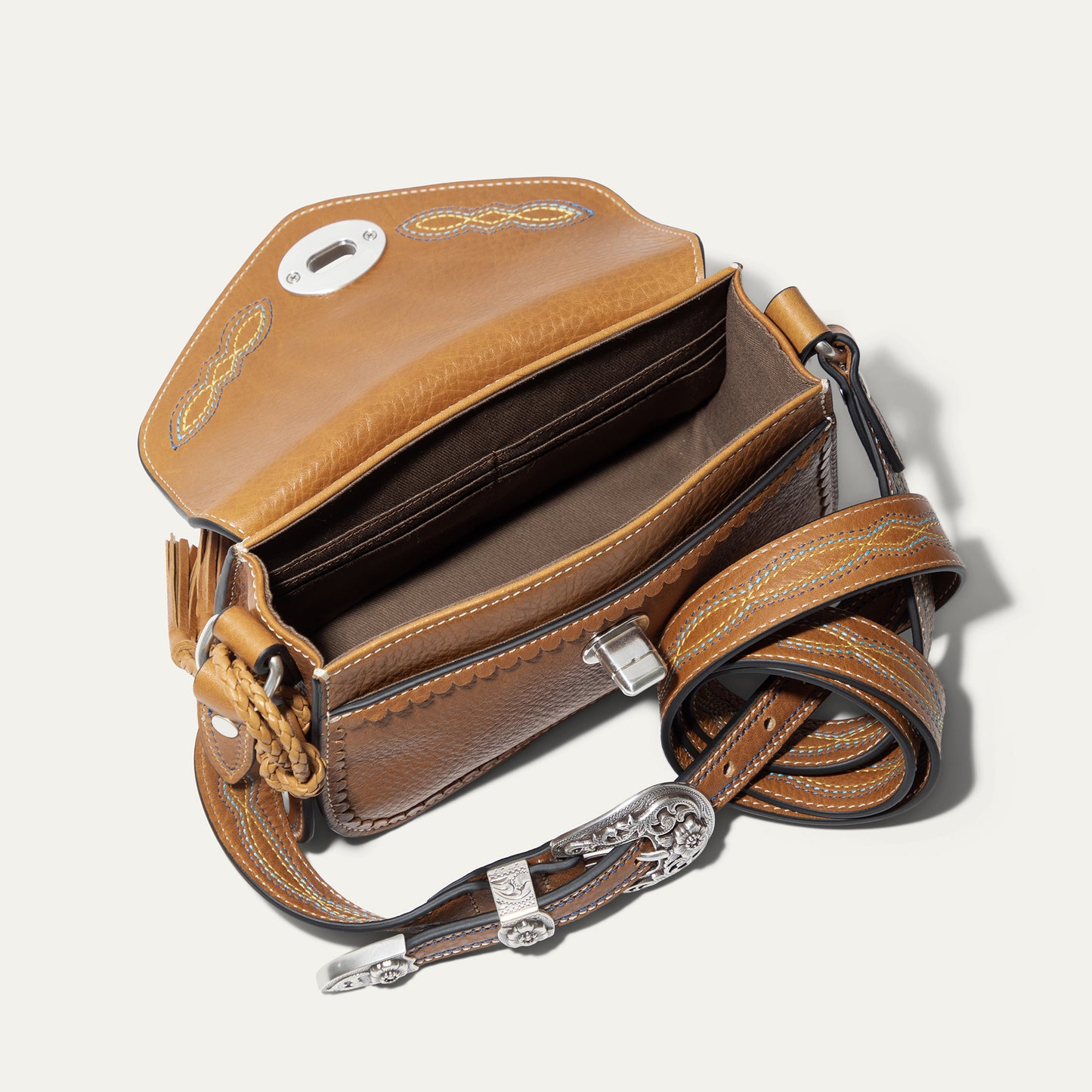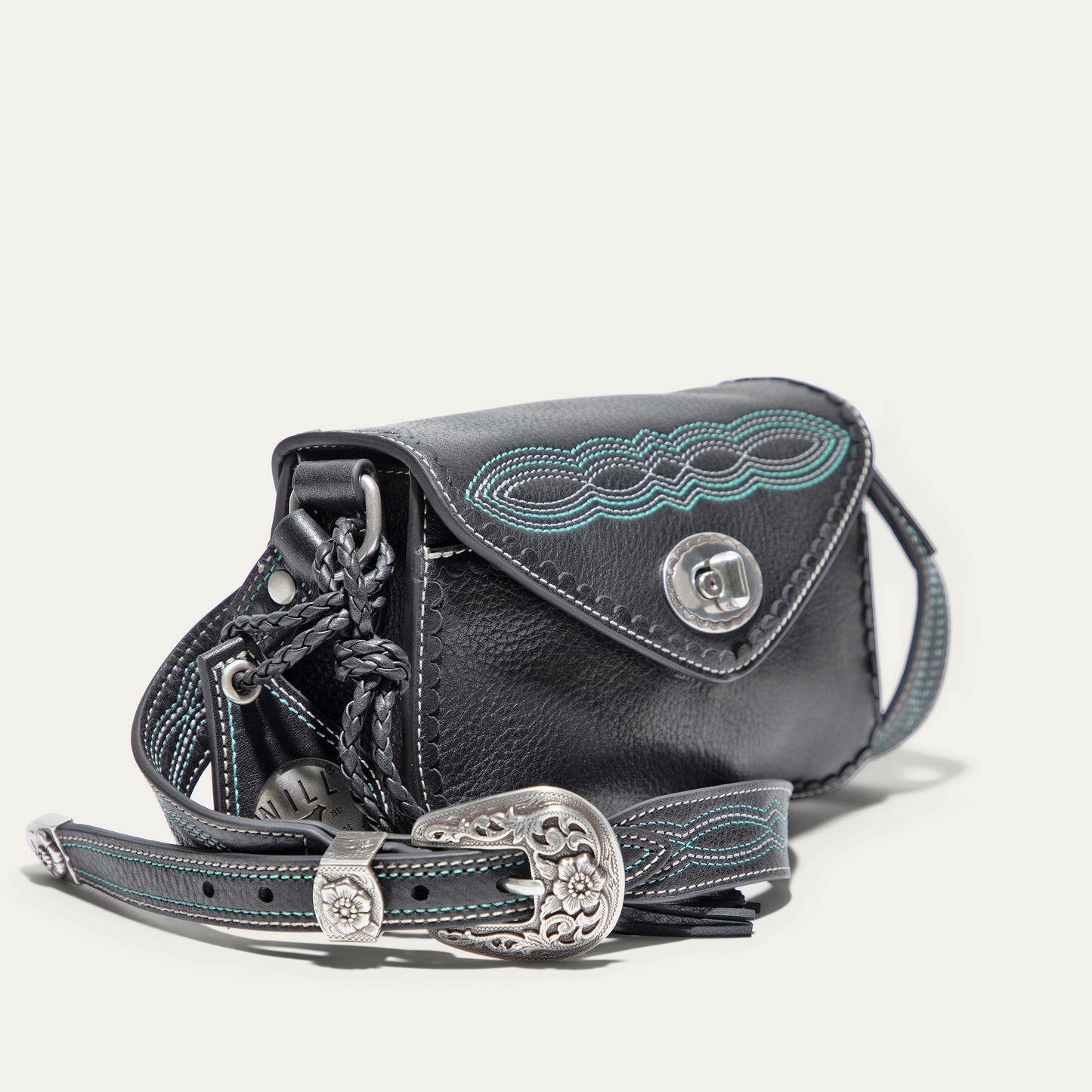 The Abilene Mini Crossbody is handcrafted from full-grain, vegetable-tanned leather. Adorned with colorful cowboy boot stitching, the flap features an antique sterling silver finish concho-inspired turn-lock for secure closure. An adjustable boot-stitched leather strap adjusts with a western three-piece buckle set to fit comfortably on the shoulder or across the body. Scalloped leather trim adds an artisanal touch. A hand-braided leather strap with tassels and our leather-framed WILL medallion adds a decorative detail. Under the flap, the exterior has a slip pocket for easy and fast access to your essentials. The lined interior contains six credit card slots. Our artisans use industrial-grade, heavy-gauge nylon thread and steel rivets to ensure durability. We stand behind our product—guaranteed for life.
