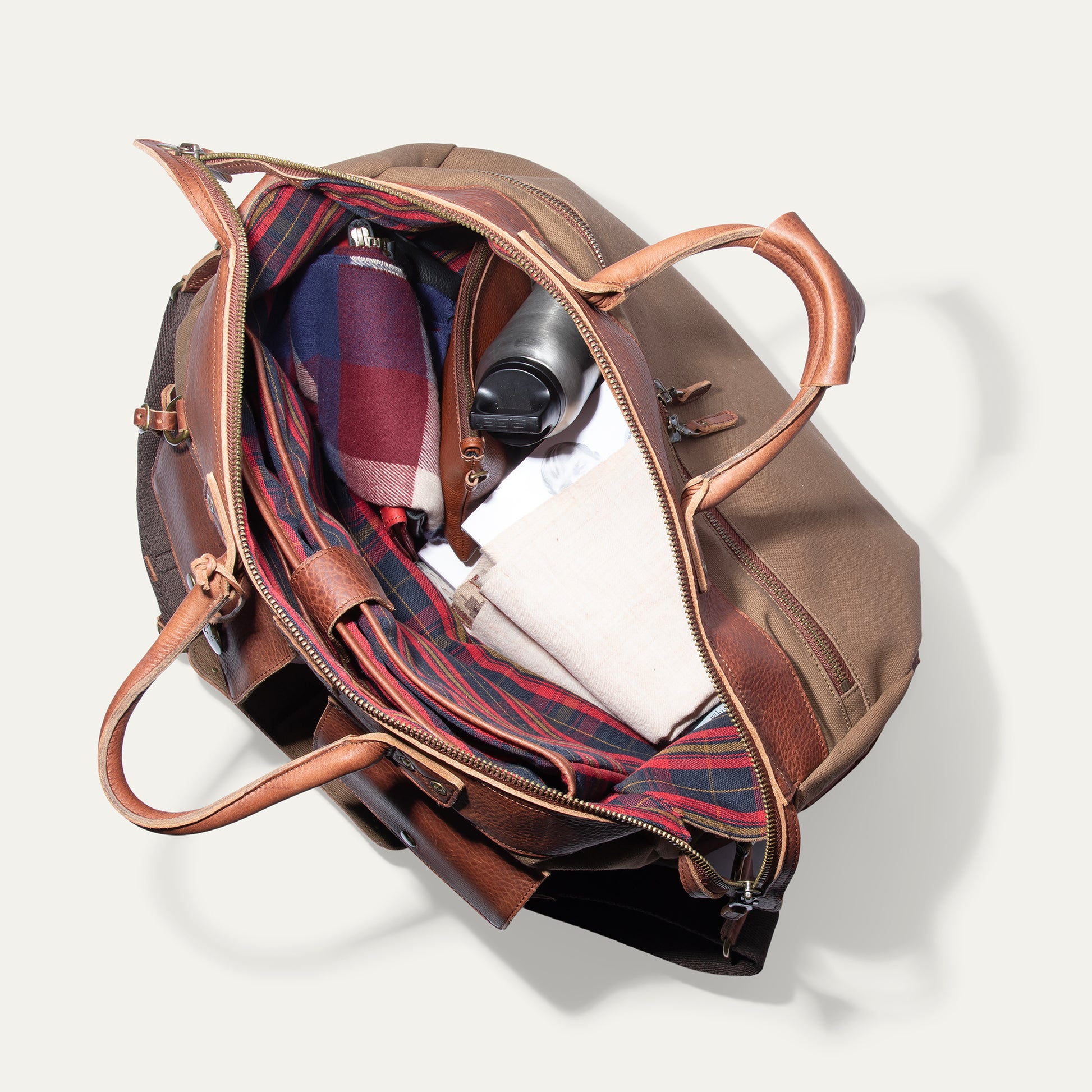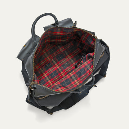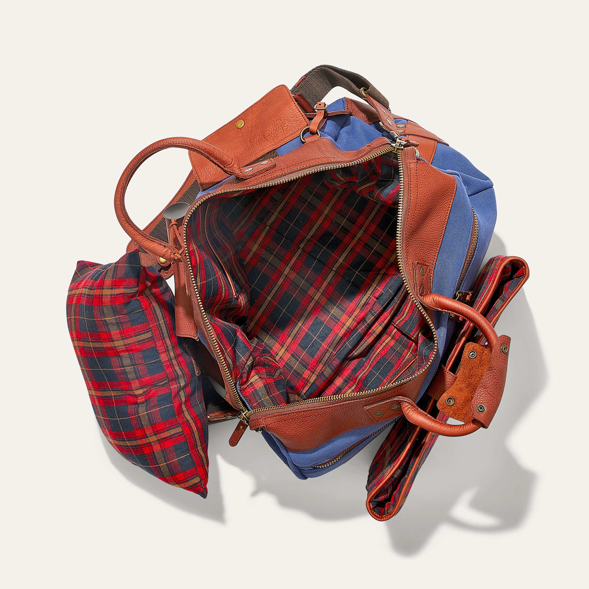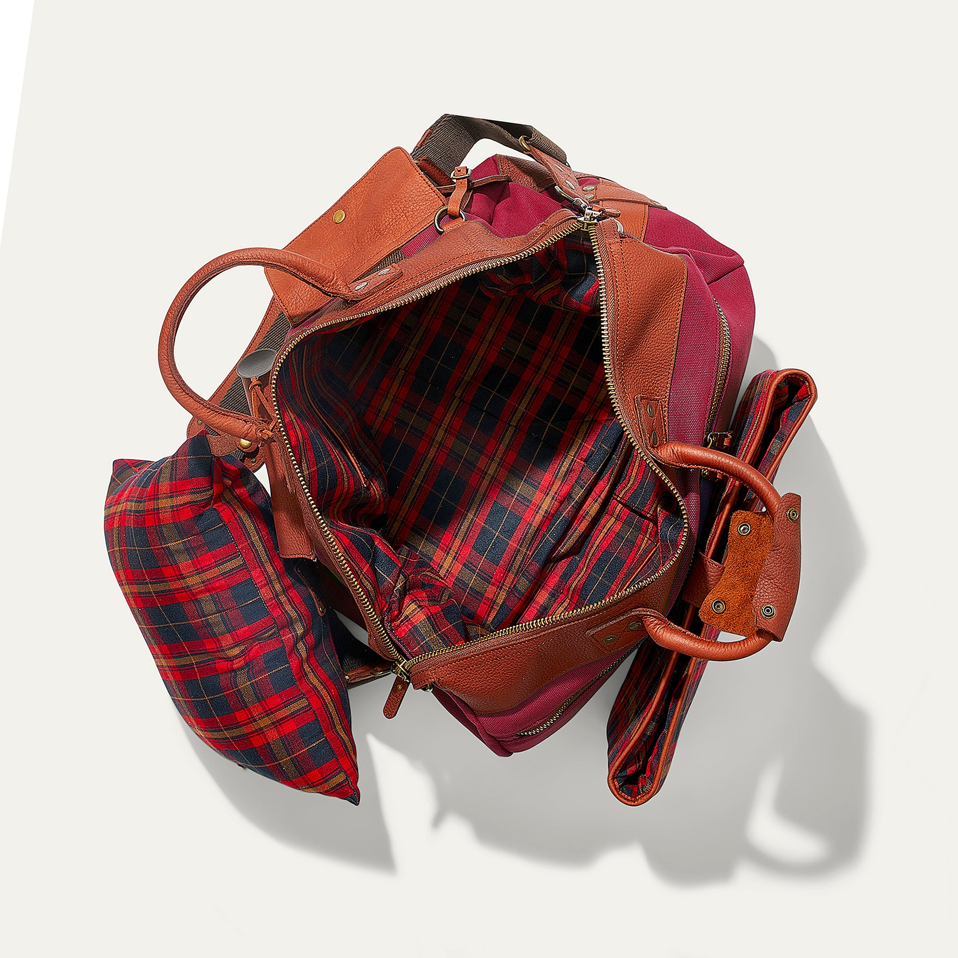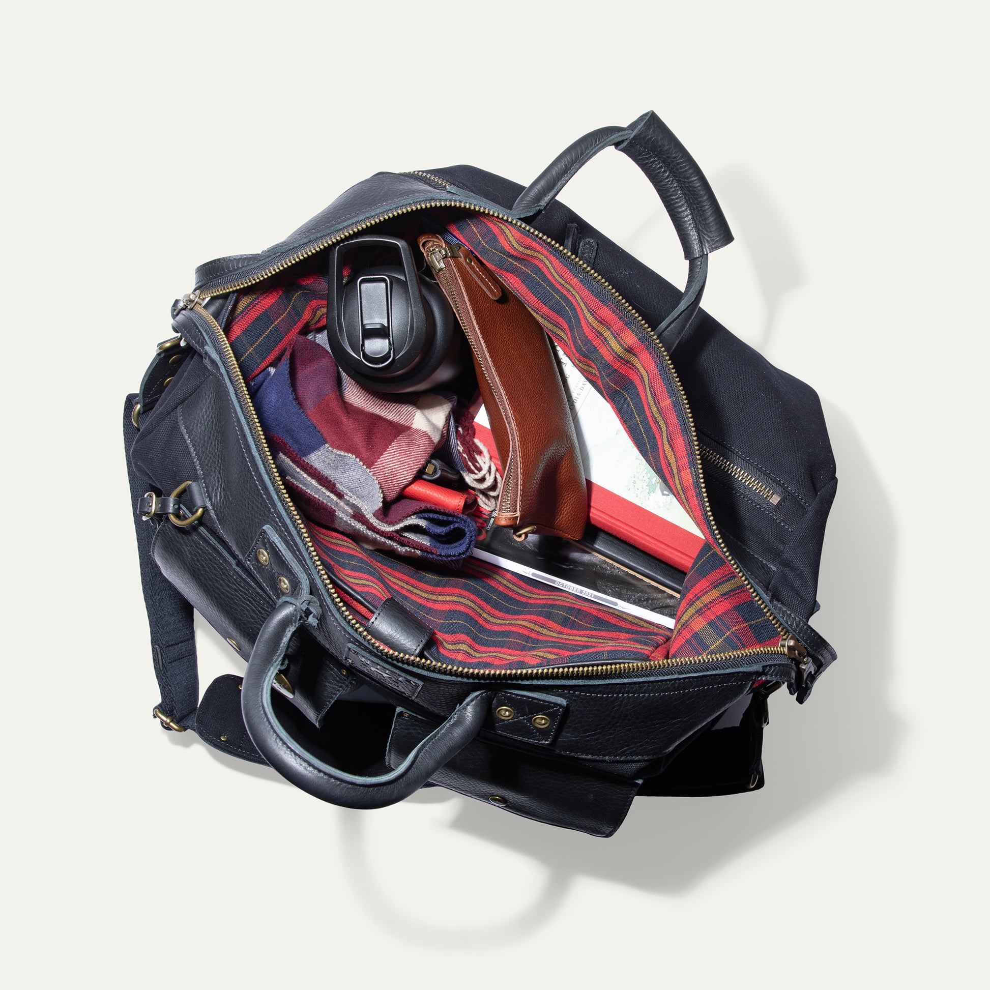 Designed and built for a lifetime of journeys, our Signature Canvas and Leather Travel Duffle combines 18-ounce industrial-grade 100% cotton canvas with our proprietary full-grain, vegetable-tanned leather. Our skilled artisans take 139 steps from the first cut of the leather to the final hand-hammered rivet to ensure our Travel Duffle lasts a lifetime—we guarantee it. Double-reinforced box stitching, dual hand-hammered steel rivets, and a leather top-handle wrap allow you to tote your duffle by hand. Our detachable and adjustable industrial-grade cotton webbing strap with removable memory foam pad can be slung on the shoulder or across your torso. A convenient hidden trolley sleeve allows you to securely place your travel duffle on top of a rolling suitcase. Two exterior flap pockets close with steel snaps and finger bridges for easy access, while a large back zipper pocket will hold your belongings as you head through airport security. Lined in our signature plaid, the interior features extensive organization—including a roomy zipper pocket, three slip pockets, a business card slot, an antique brass key clip, and a removable padded laptop sleeve. We stand behind our product—guaranteed for life.