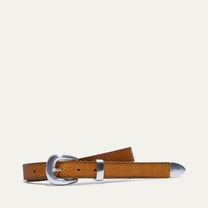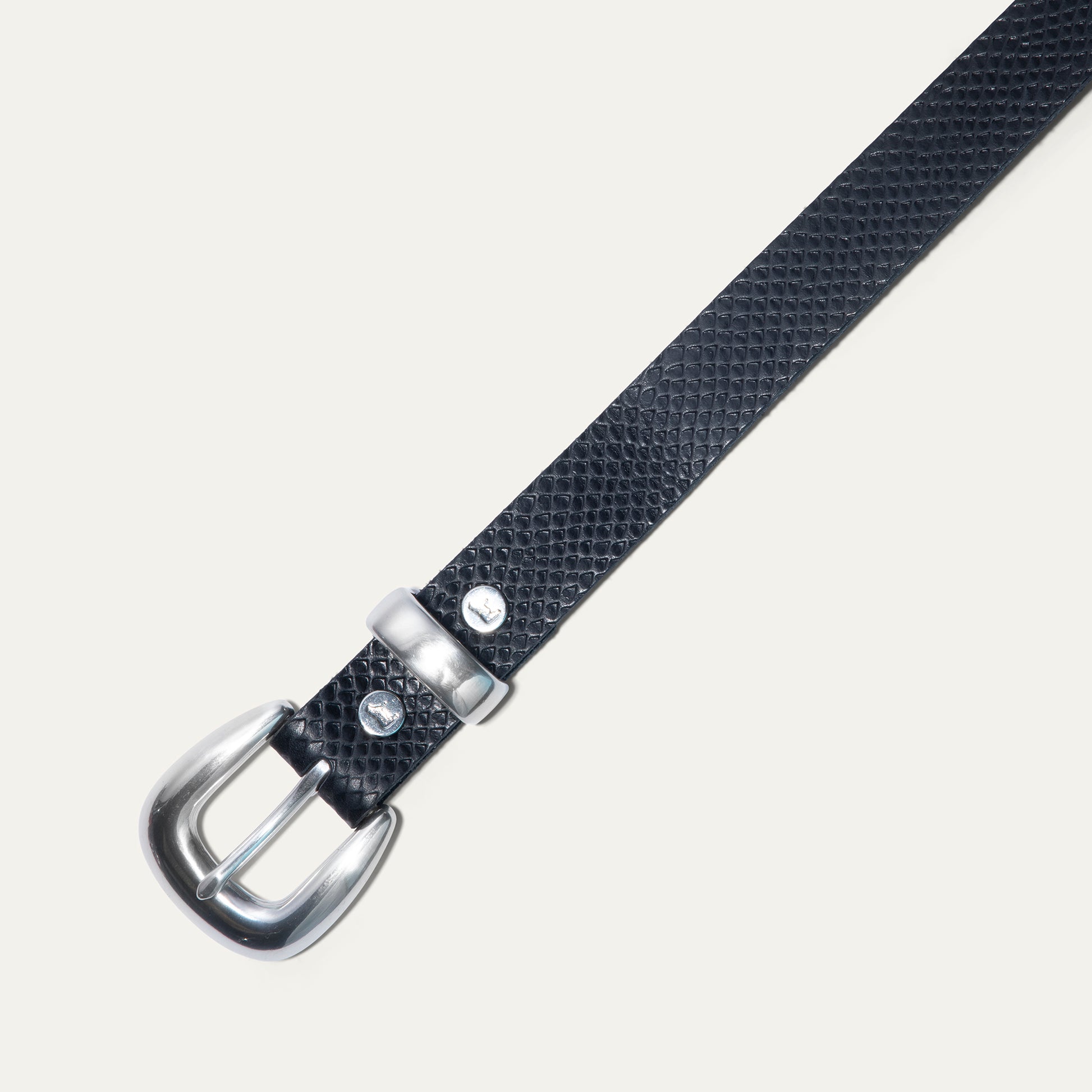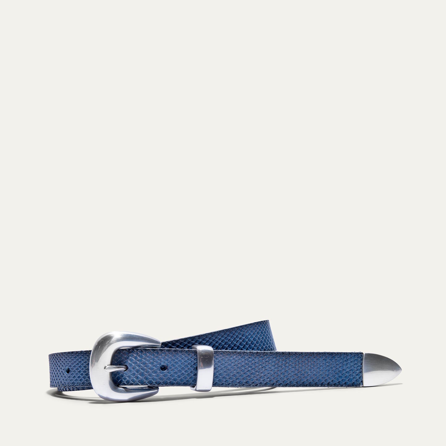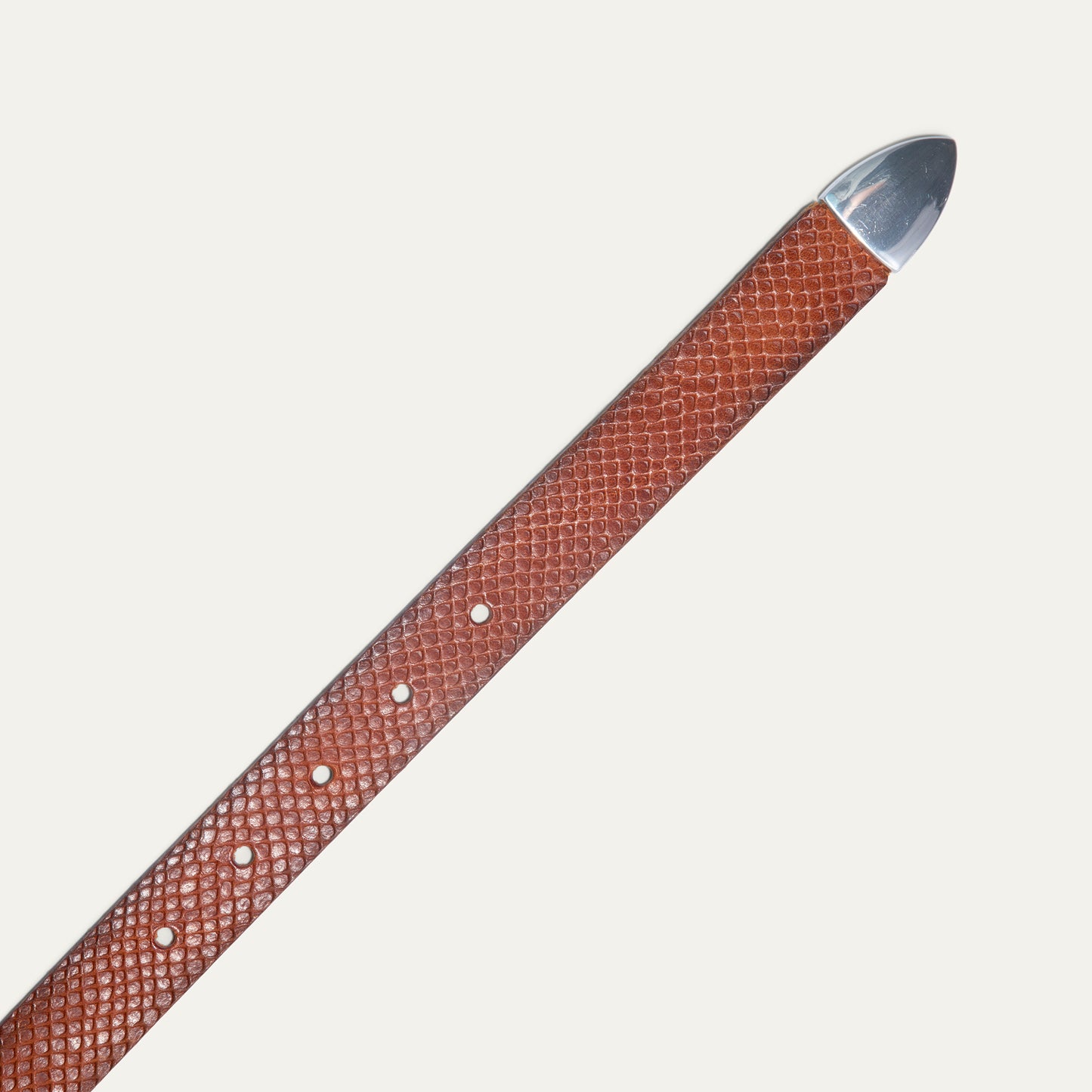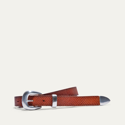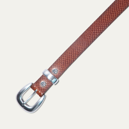 Our embossing process reveals a snakeskin texture carved into the full-grain leather. Lightweight and supple, the perimeter of the 25 mm belt is darkened during our finishing process to add dimension.