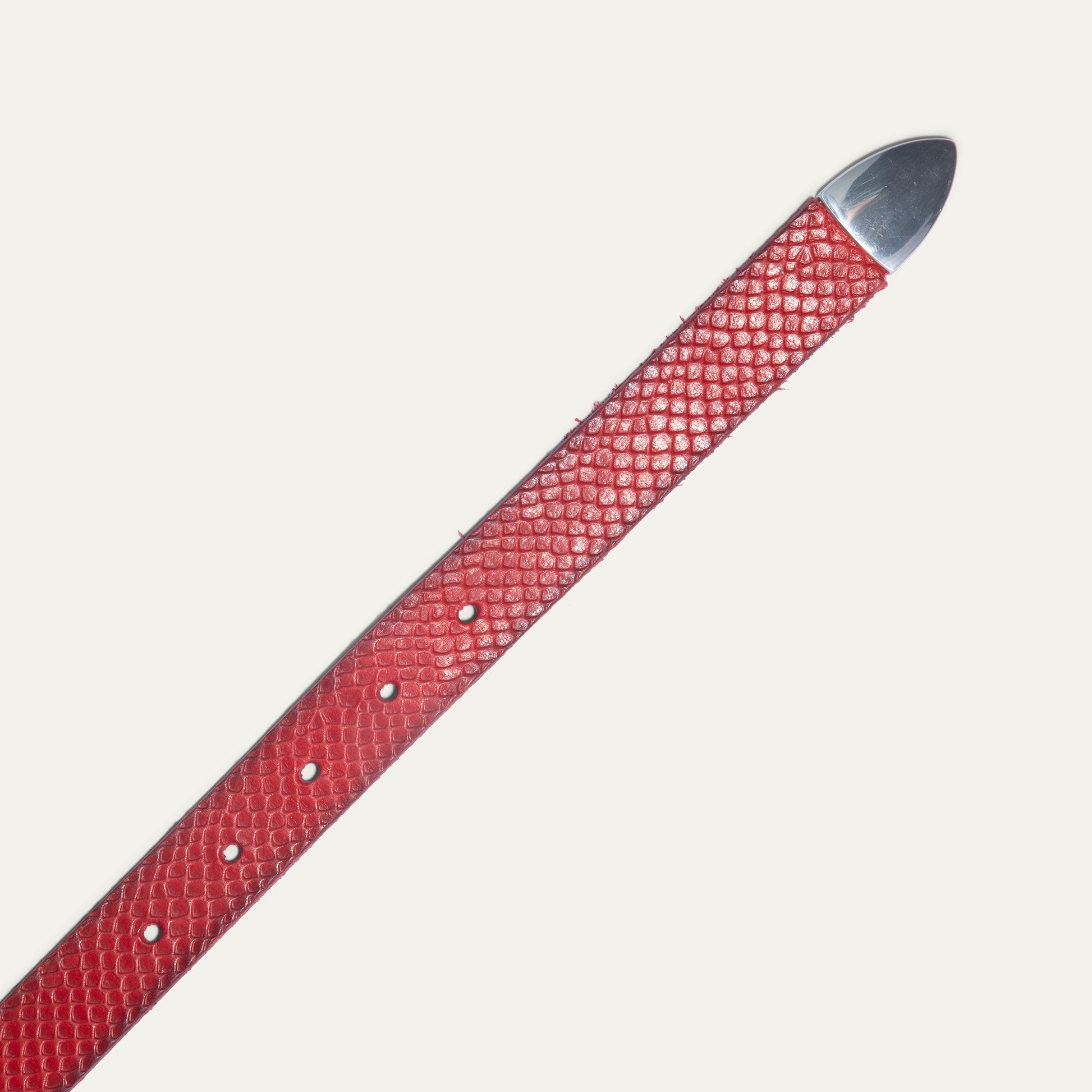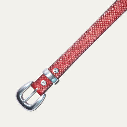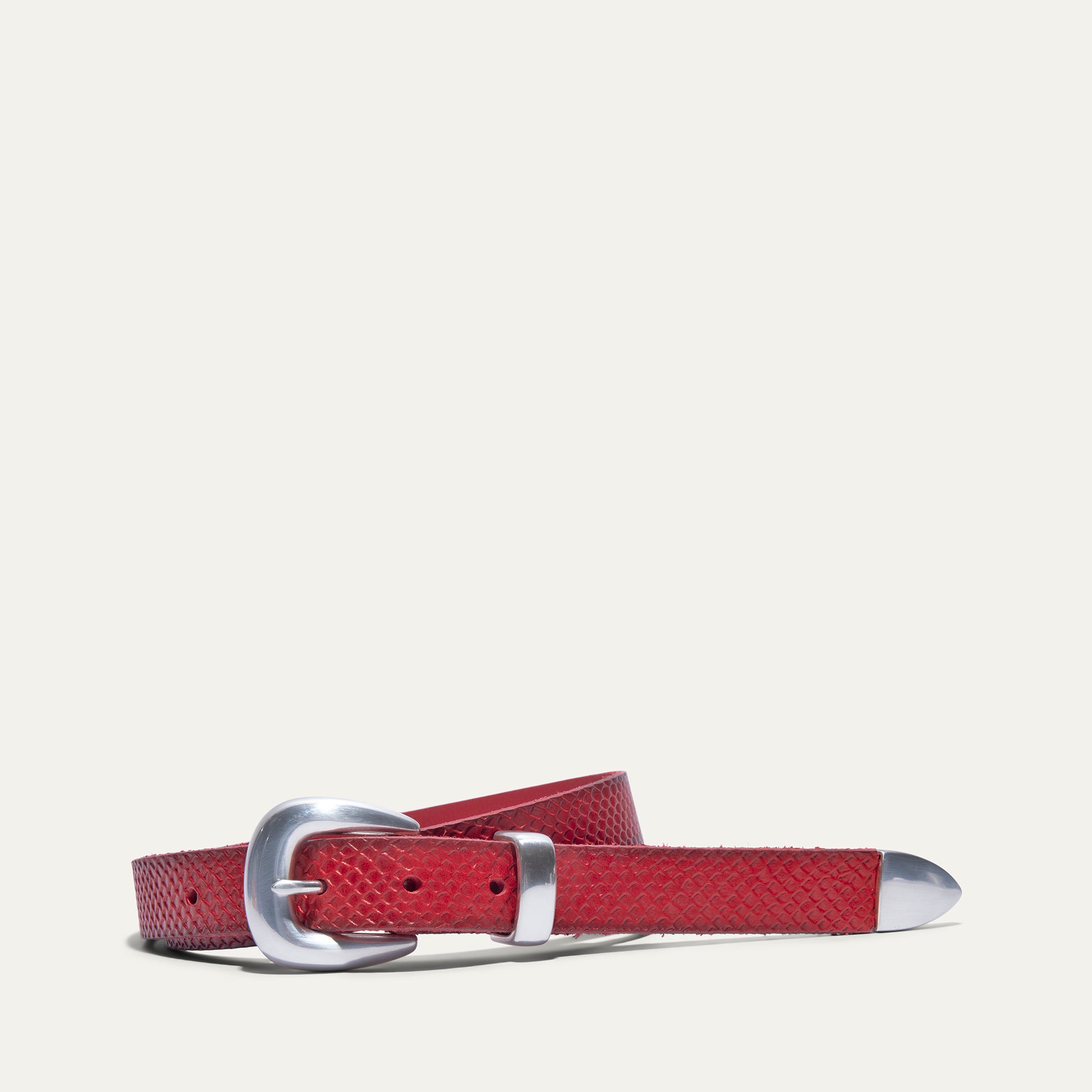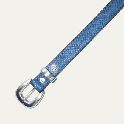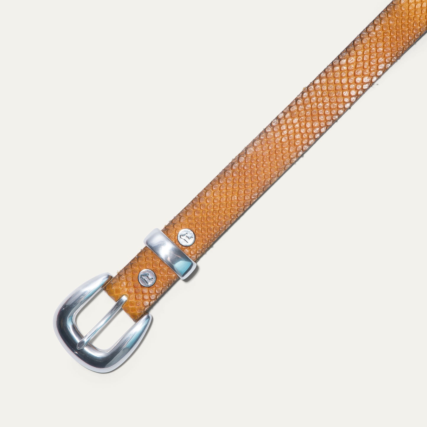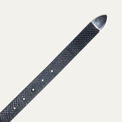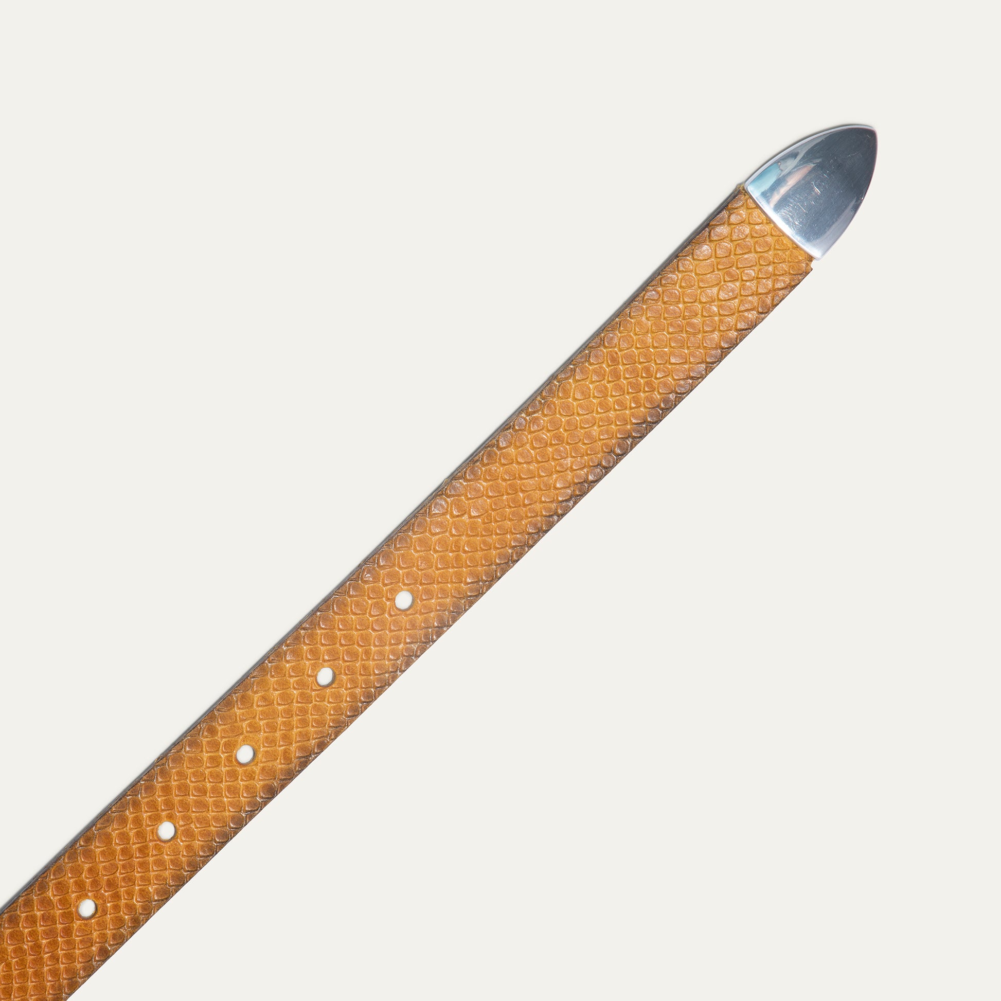 Our embossing process reveals a snakeskin texture carved into the full-grain leather. Lightweight and supple, the perimeter of the 25 mm belt is darkened during our finishing process to add dimension.