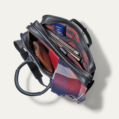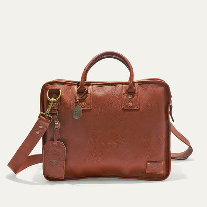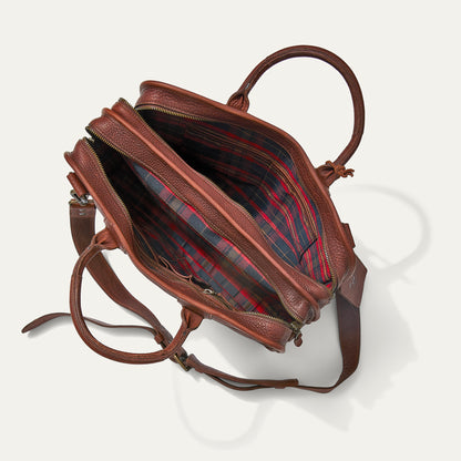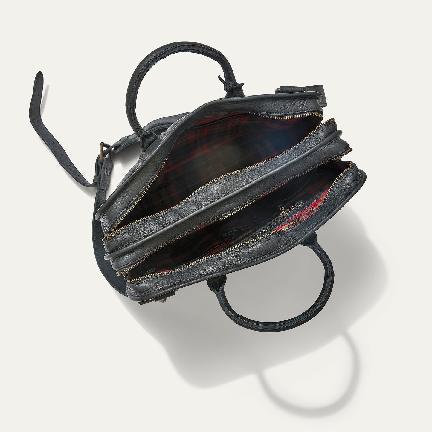 Our Signature Leather Hank Double Zip Briefcase is handcrafted with full-grain vegetable-tanned leather. Solid brass two-way YKK zippers allow fast and secure entry into each compartment, the front featuring padding and a laptop/tablet sleeve, and the back offering well-appointed interior organization including a roomy zipper pocket, three slip pockets, a business card slot, and an antique brass key clip. Our signature luggage tag allows for identification, while a zippered trolley sleeve on the back panel allows you to easily slide your Hank Briefcase over your rolling suitcase handle. Soft, padded rolled leather handles offer a comfortable grip and are secured with box-stitching and dual-rivet reinforcement. The adjustable leather strap with removable shoulder pad is highly adjustable, allowing you to wear the Hank on the shoulder or across the torso. Leather binding and base panels ensure the Hank Leather Double Zip briefcase is built for a lifetime of journeys. We stand behind our product—guaranteed for life.