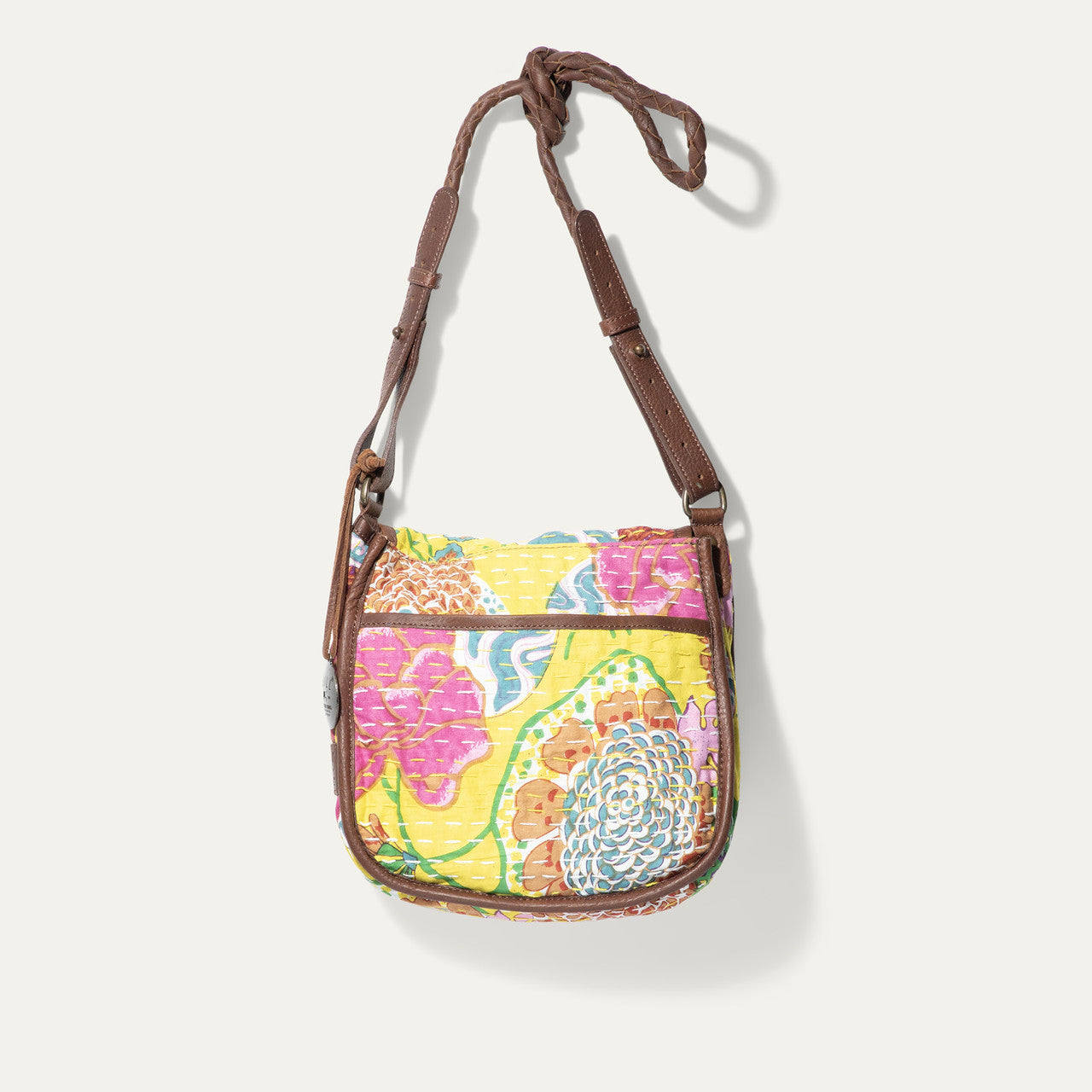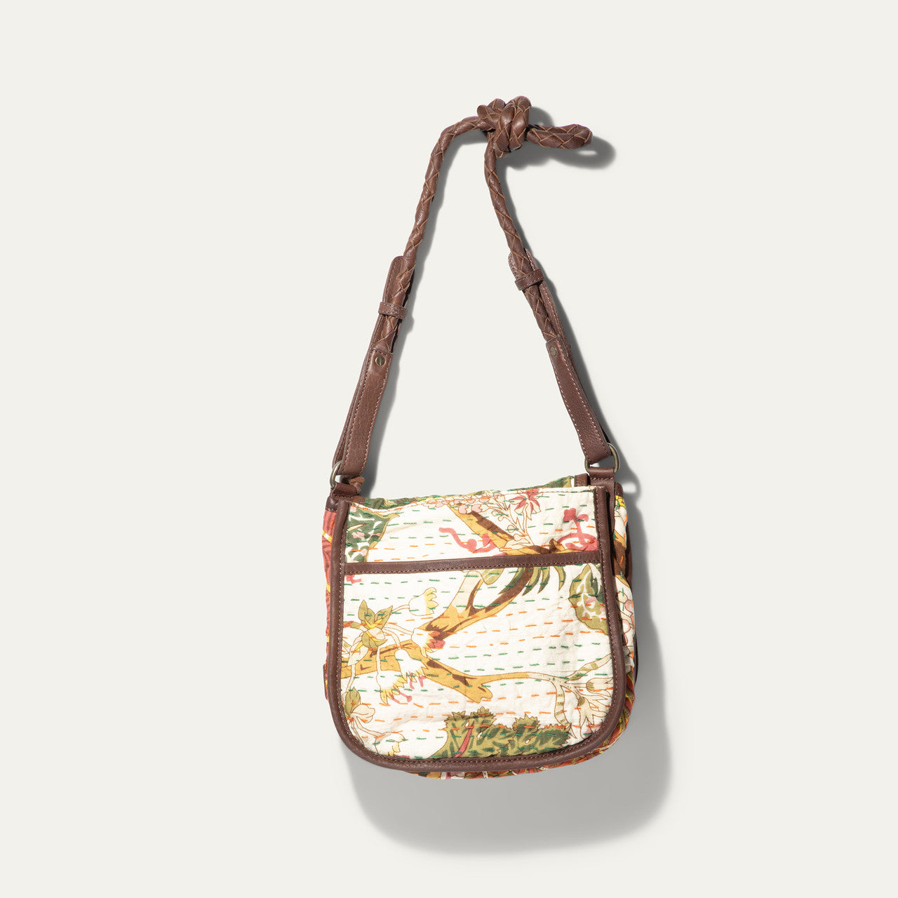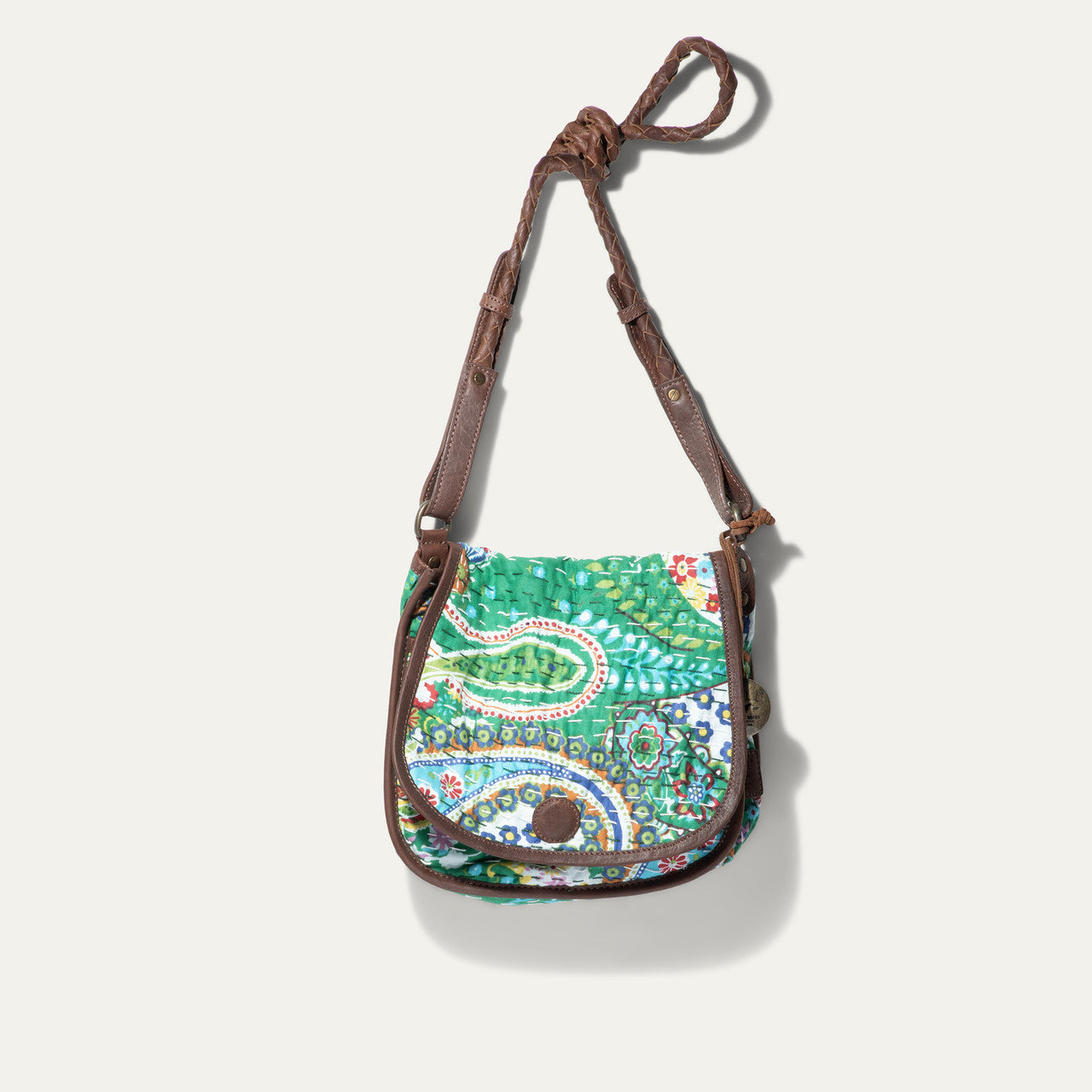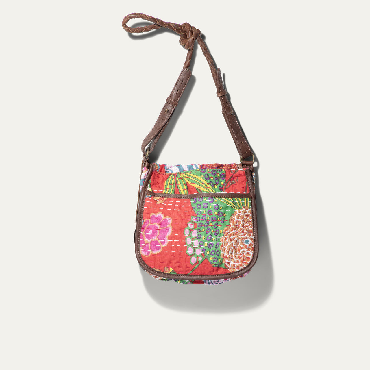 Our one-of-a-kind Kantha Reversible Crossbody is handcrafted from upcycled vintage kantha quilts from the West Bengal region of India and paired with full-grain, vegetable-tanned leather trim. Designed to be reversible to show both unique and artful sides of each quilt, simply flip the Kantha Crossbody inside out to reveal a new design. Adjustable, handwoven, knotted straps fit easily on the shoulder and comfortably across the torso for your hands-free carrying needs. A hidden magnetic snap keeps your contents secure, while a slip pocket allows fast access to your keys and phone. Leather binding, steel-riveted handle reinforcements, and industrial-grade nylon thread ensure your Kantha Reversible Hobo will last a lifetime. We stand behind our product—guaranteed for life.