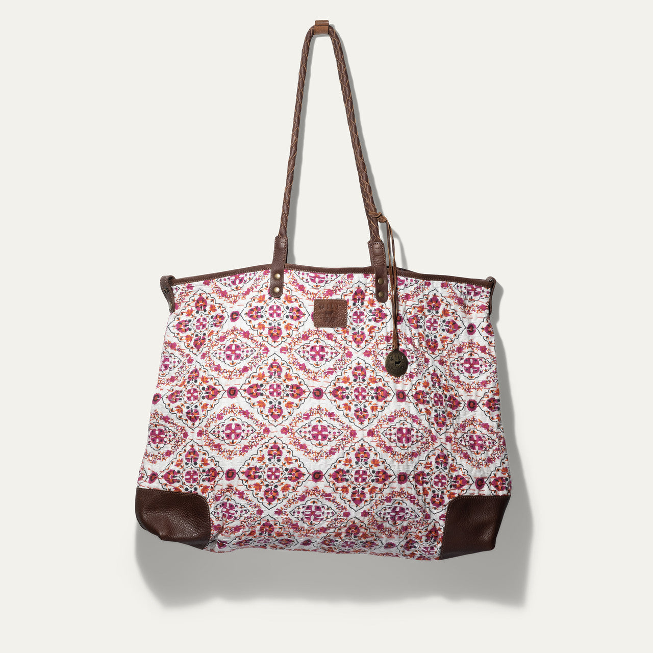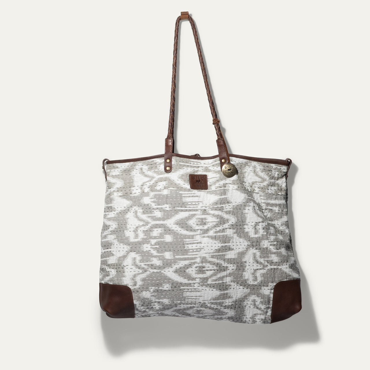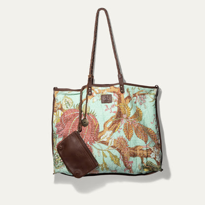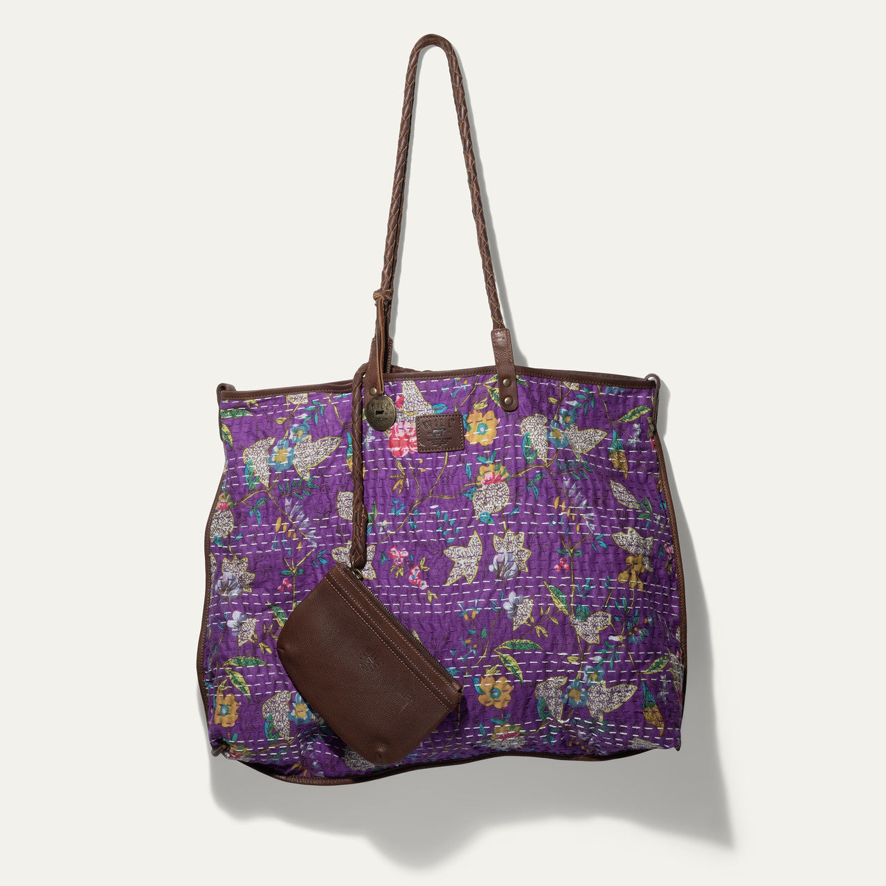 Our one-of-a-kind Kantha Reversible Tote is handcrafted from upcycled vintage kantha quilts from the West Bengal region of India and paired with full-grain, vegetable-tanned leather trim. Designed to be reversible to show both unique and artful sides of each quilt, simply flip the Kantha Tote inside out to reveal a new design. Handwoven straps fit easily on the shoulder and comfortably in the hand, while a leather brass YKK zippered pouch clips to an antique brass ring to keep you organized. Leather binding, steel-riveted handle reinforcements, and industrial-grade nylon thread ensure your Kantha Reversible Tote will last a lifetime. We stand behind our product—guaranteed for life.