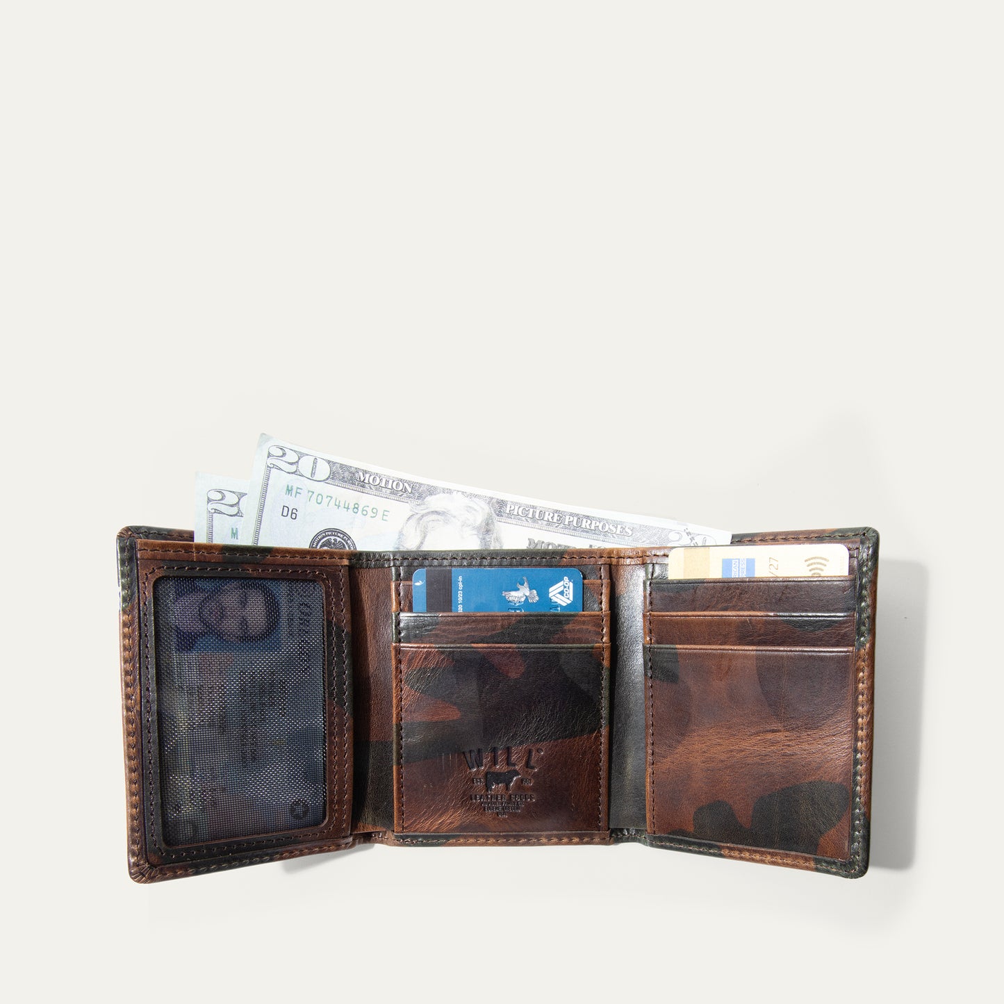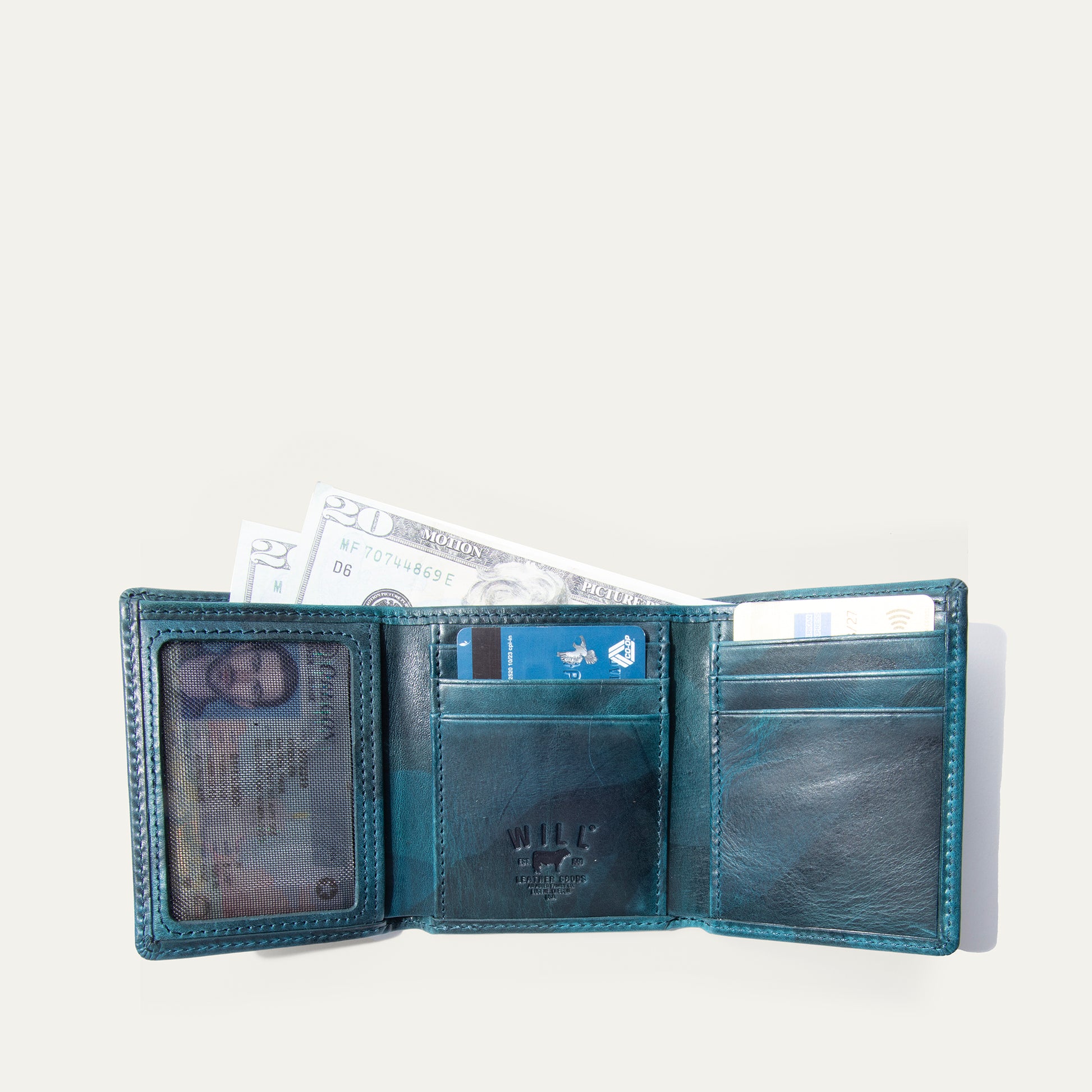 Compact in size without sacrificing plentiful organization. This trifold opens to reveal a metal mesh ID window and six card slots with two lined pockets tucked beneath them. It also contains a classic lined billfold.