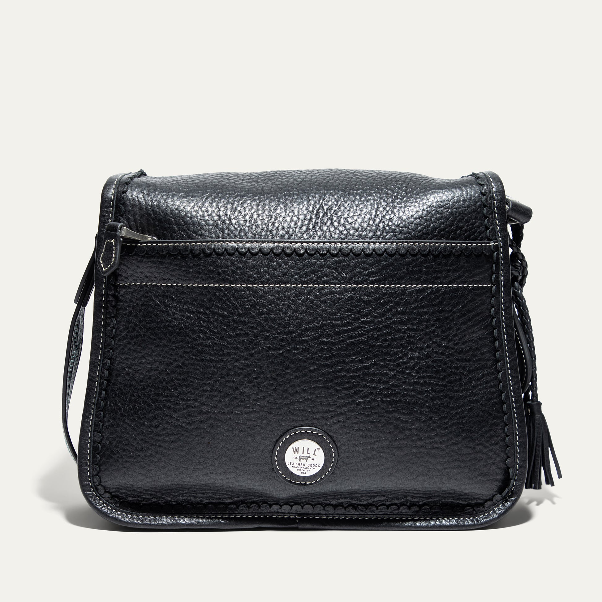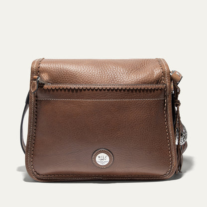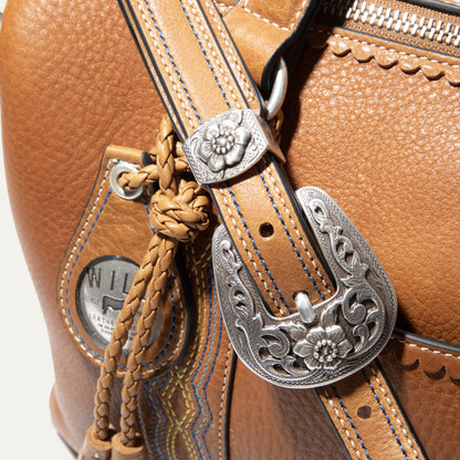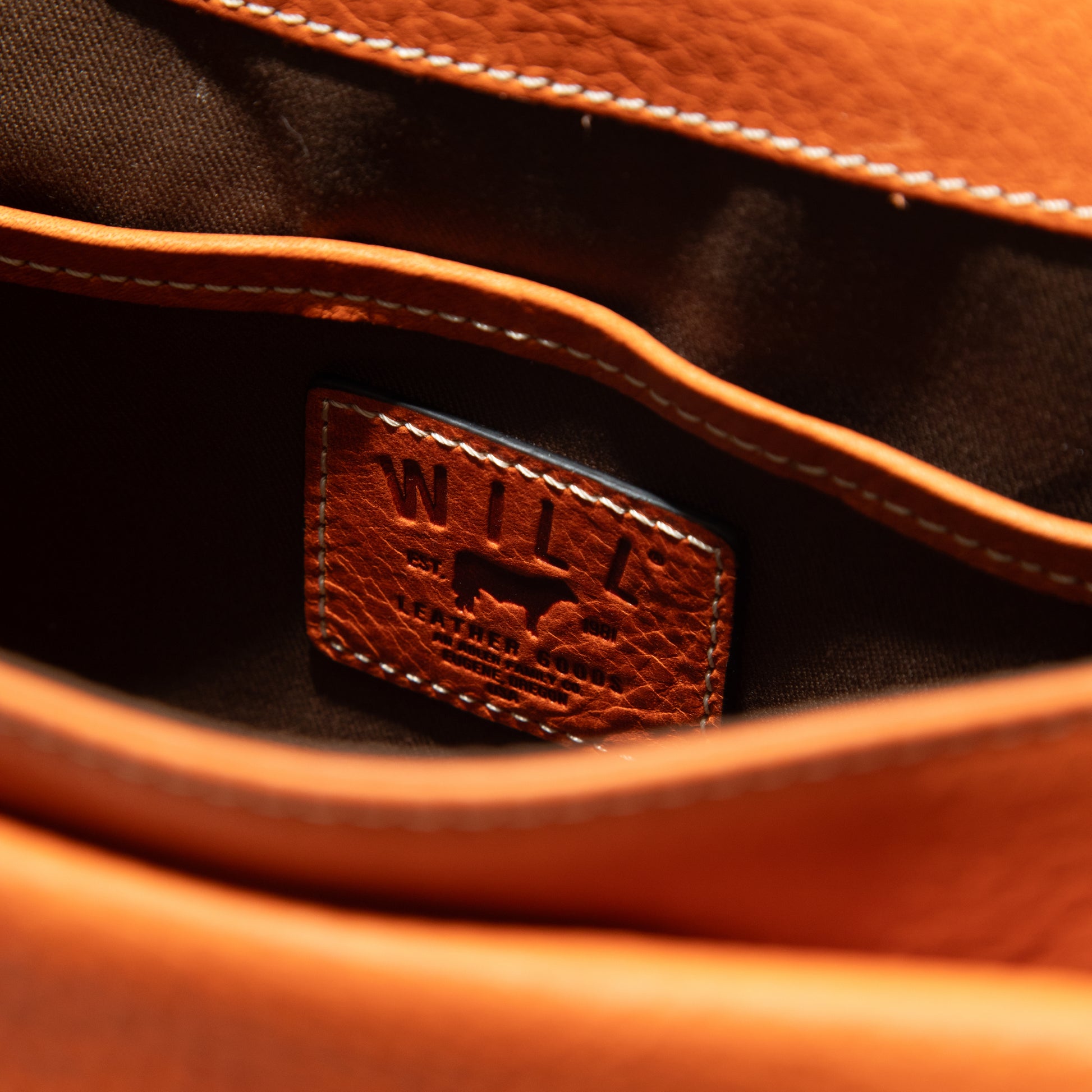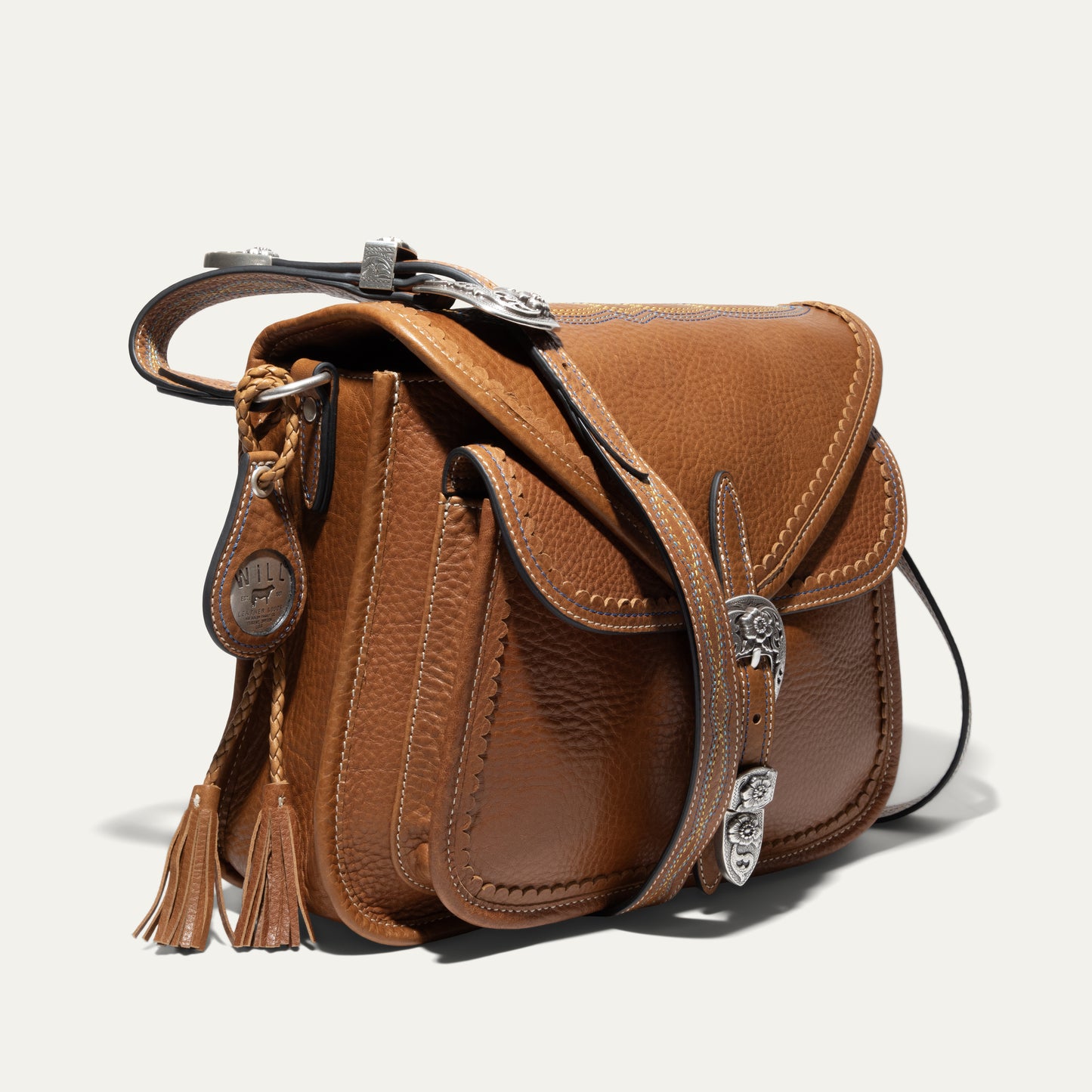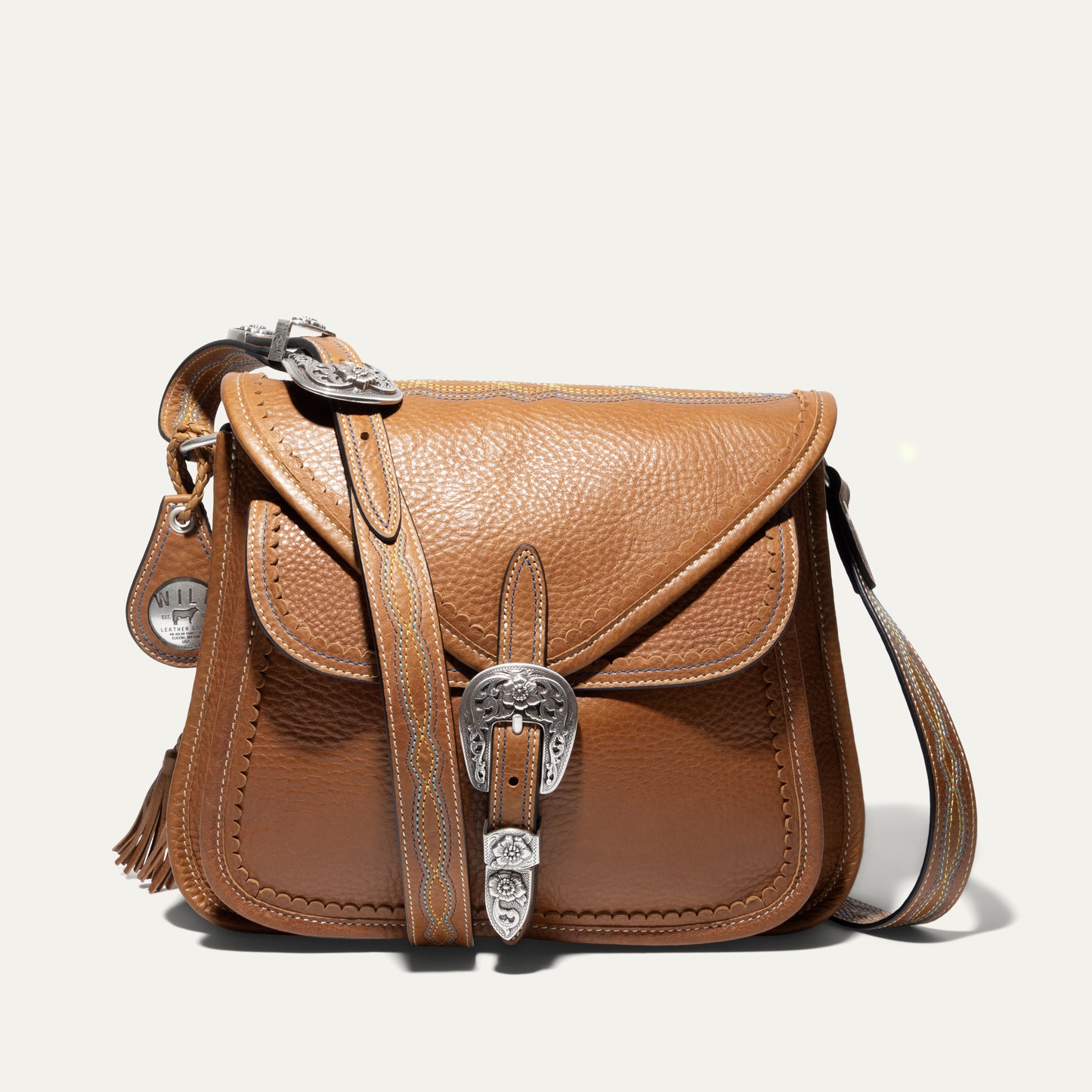 The Odessa Crossbody is handcrafted from full-grain, vegetable-tanned leather. Adorned with colorful cowboy boot stitching, the flap features an antique sterling silver finish three-piece western buckle set and secures with a magnetic snap. An adjustable boot-stitched leather strap adjusts with a western three-piece buckle set to fit comfortably on the shoulder or across the body. Scalloped leather trim adds an artisanal touch. A hand-braided leather strap with tassels and our leather-framed WILL medallion add a decorative detail. Under the flap, the exterior has a flap pocket for easy and fast access to your essentials, while a brass YKK zippered pocket keeps items secure and close to your body. The lined interior contains a slip pocket. Our artisans use industrial-grade, heavy-gauge nylon thread, leather binding, and steel rivets to ensure durability. We stand behind our product—guaranteed for life.