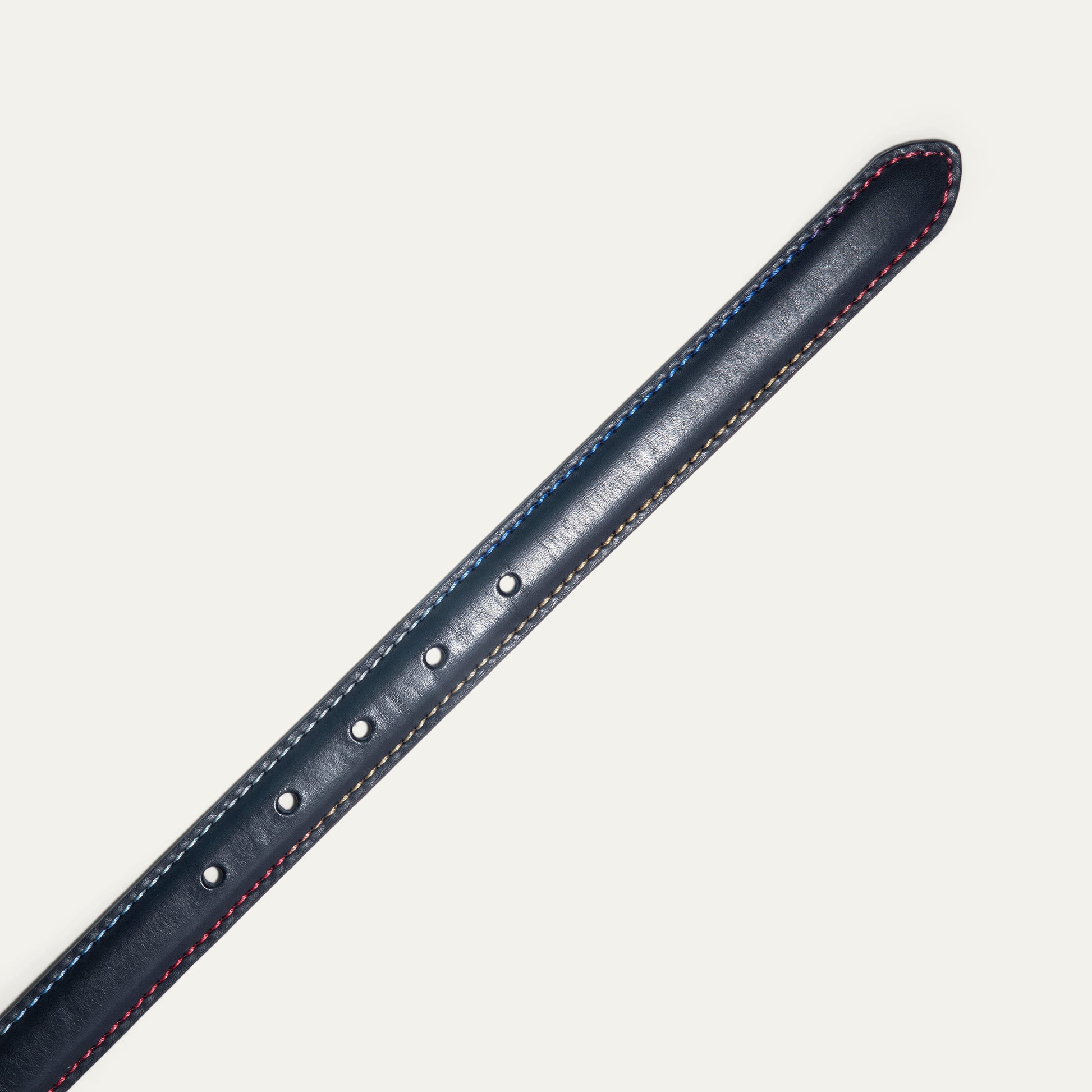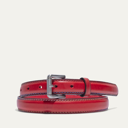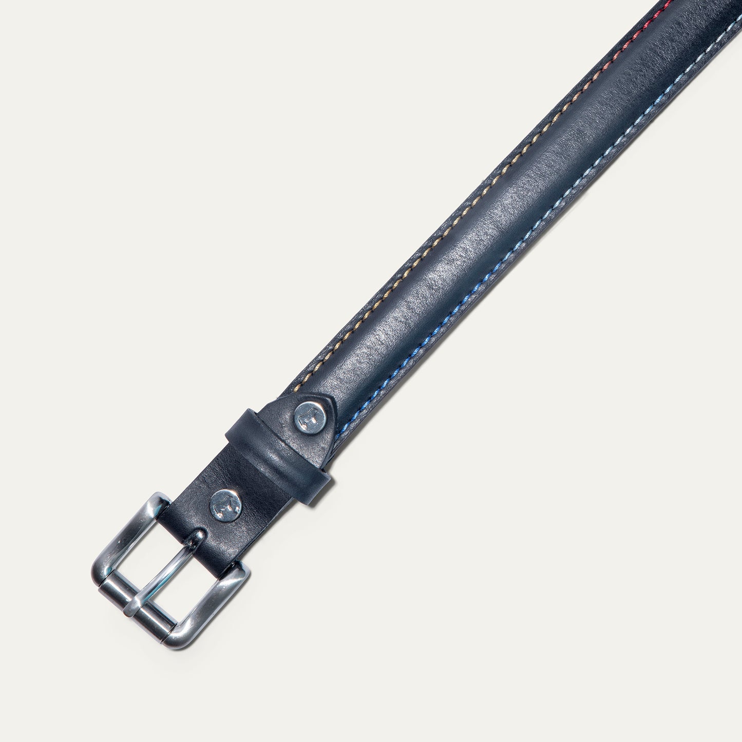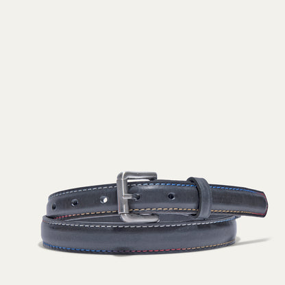 The contemporary 25mm belt fits smaller belt loops and is available in an array of bright colors featuring rainbow stitching which lines the perimeter of the belt. Its namesake stitching is comprised of one single piece of thread stained every two inches in a meticulous tie-dye-like process to create the eye-catching rainbow gradient.