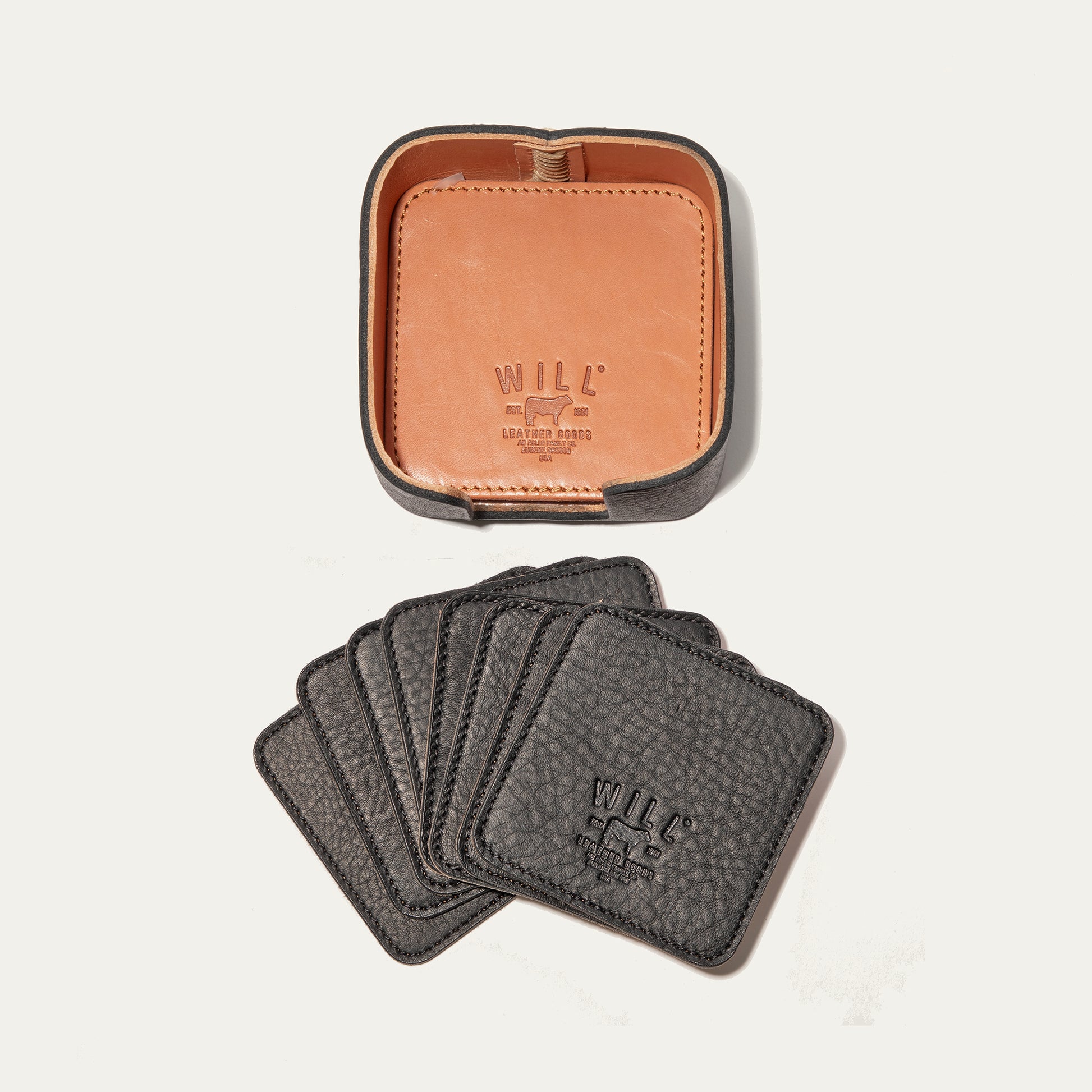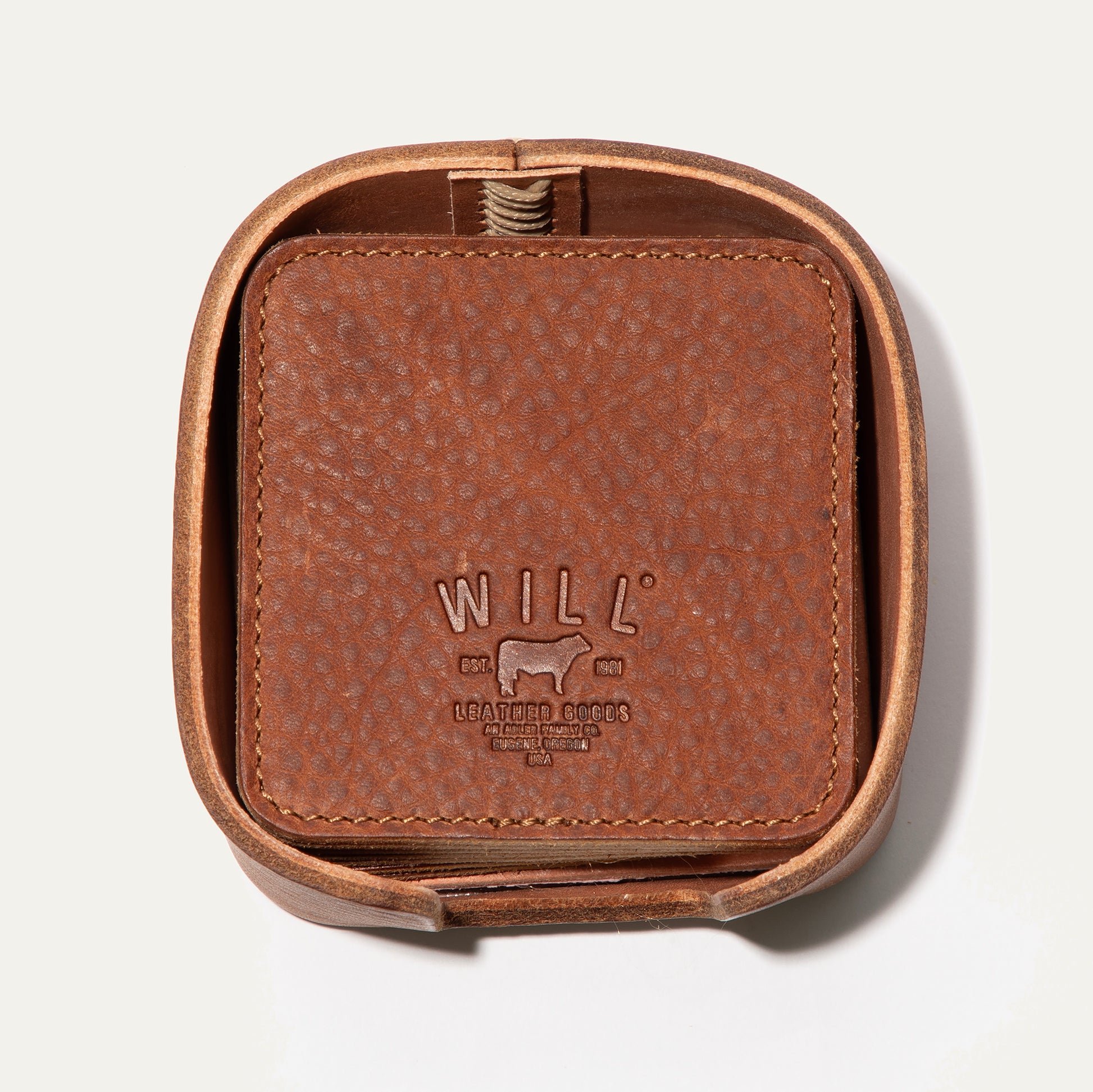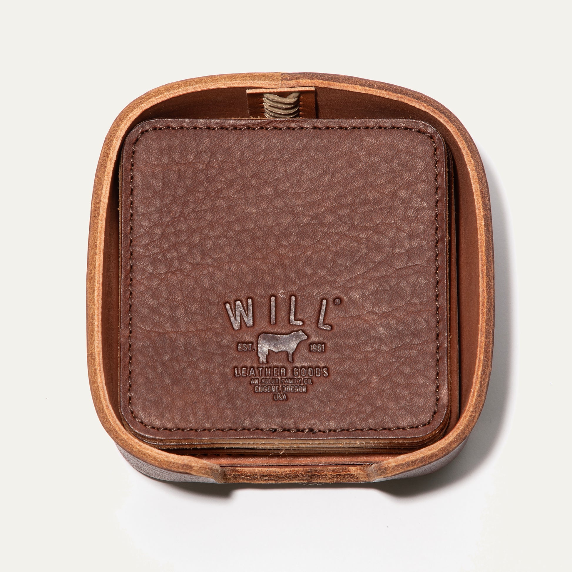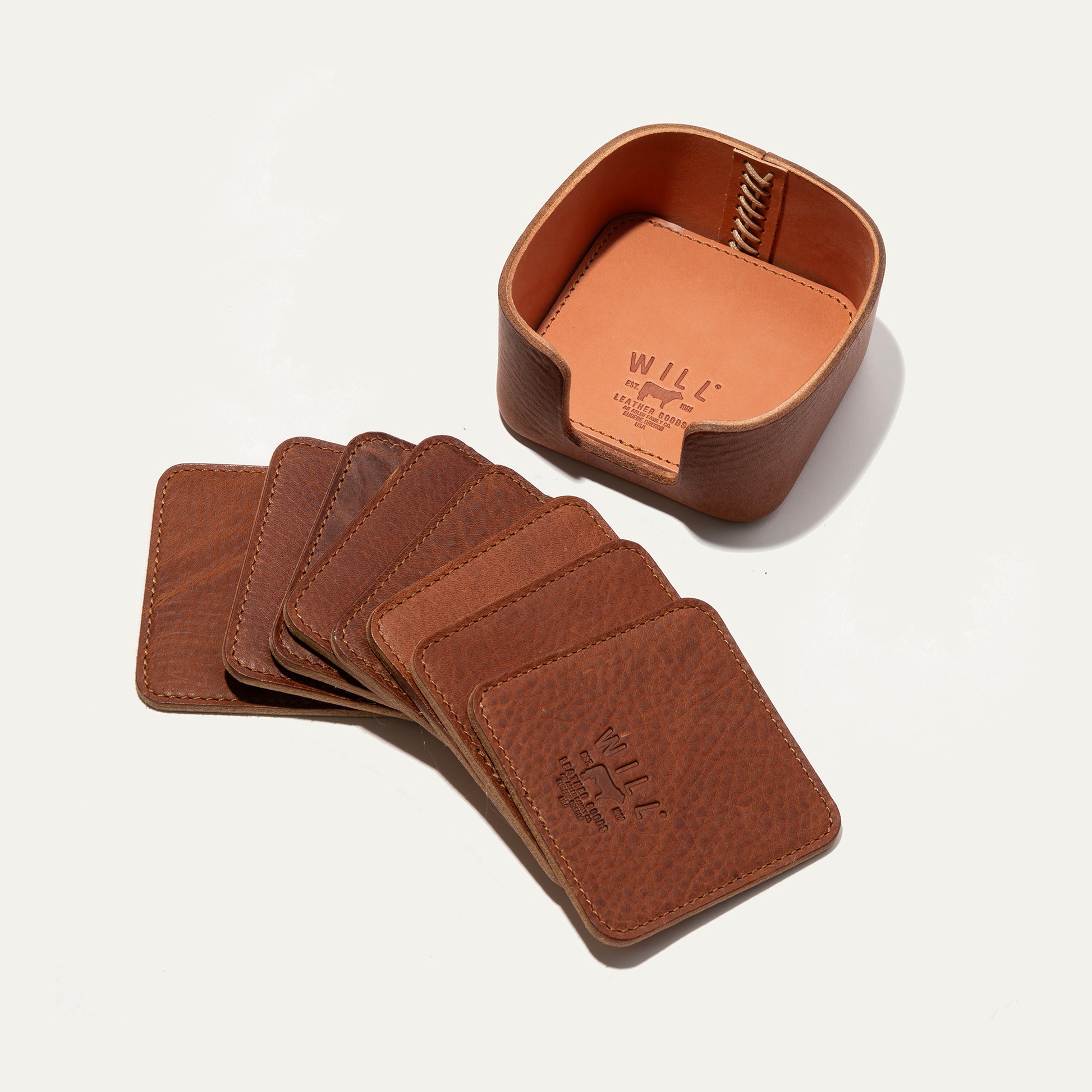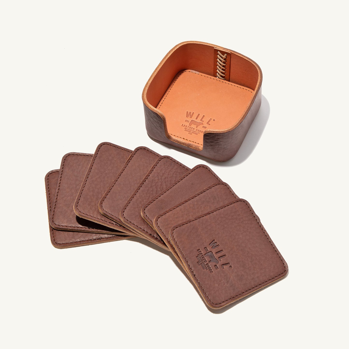 Our Leather Coaster Set is handcrafted from full-grain, vegetable-tanned leather. Eight square leather coasters with rounded corners come in a hand-laced, molded leather holder. Each coaster is debossed with the Will Leather Goods logo and stitched to a natural vachetta leather bottom panel. Hand-burnished edges and heavy-gauge industrial nylon thread to ensure durability. We stand behind our product—guaranteed for life.