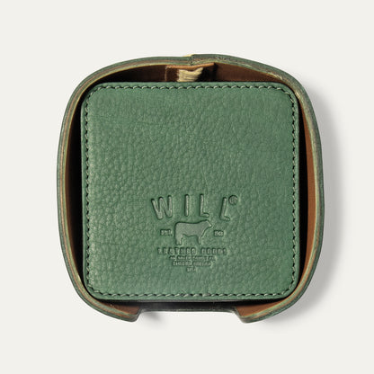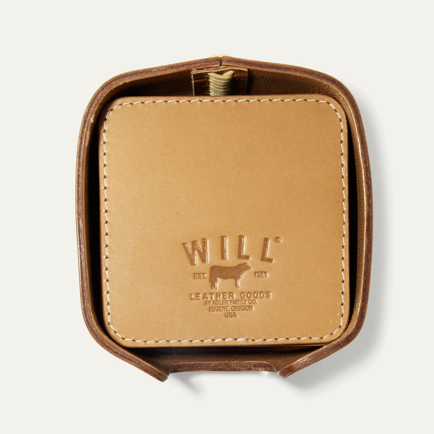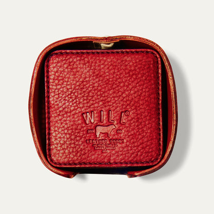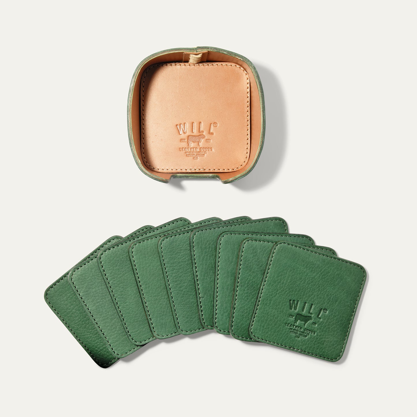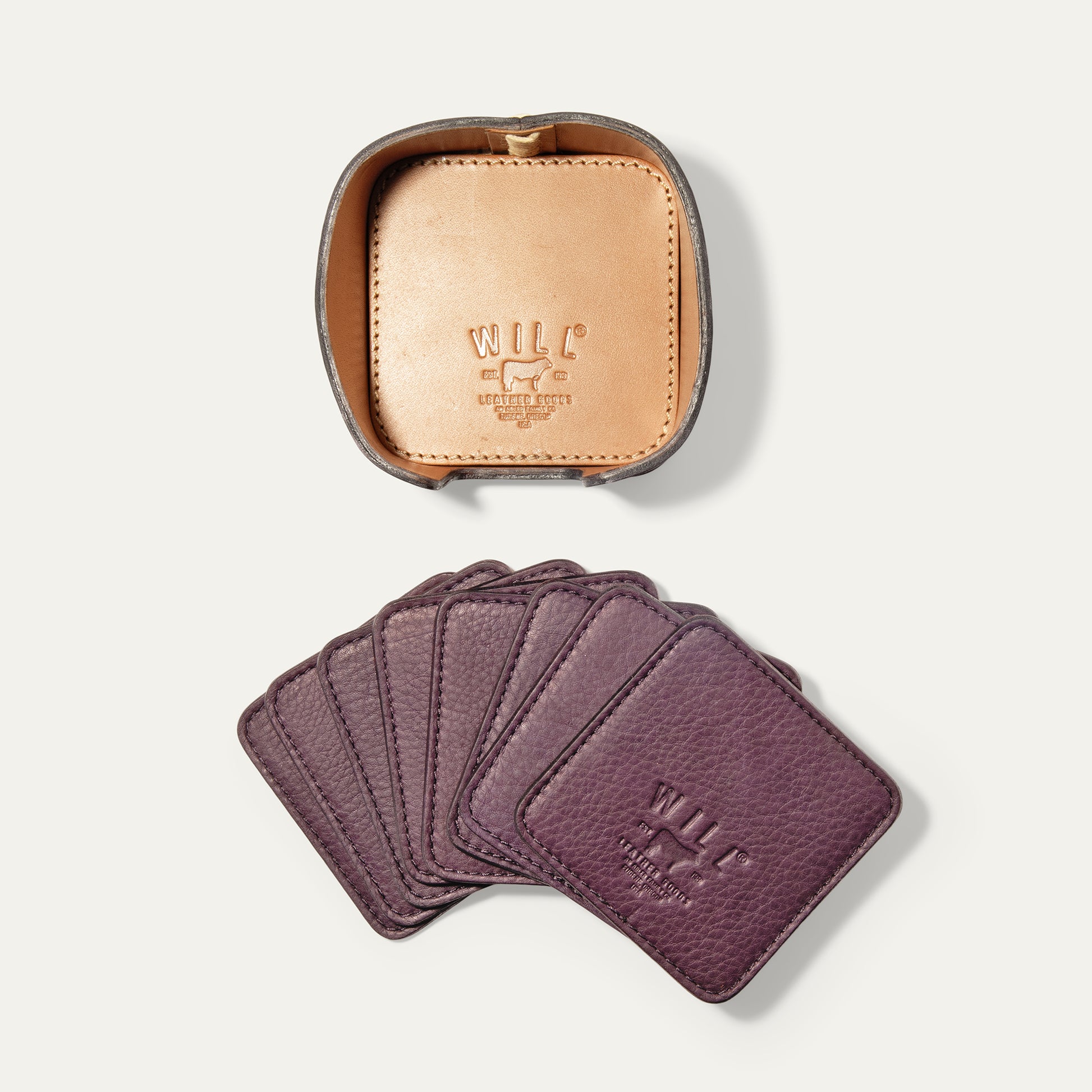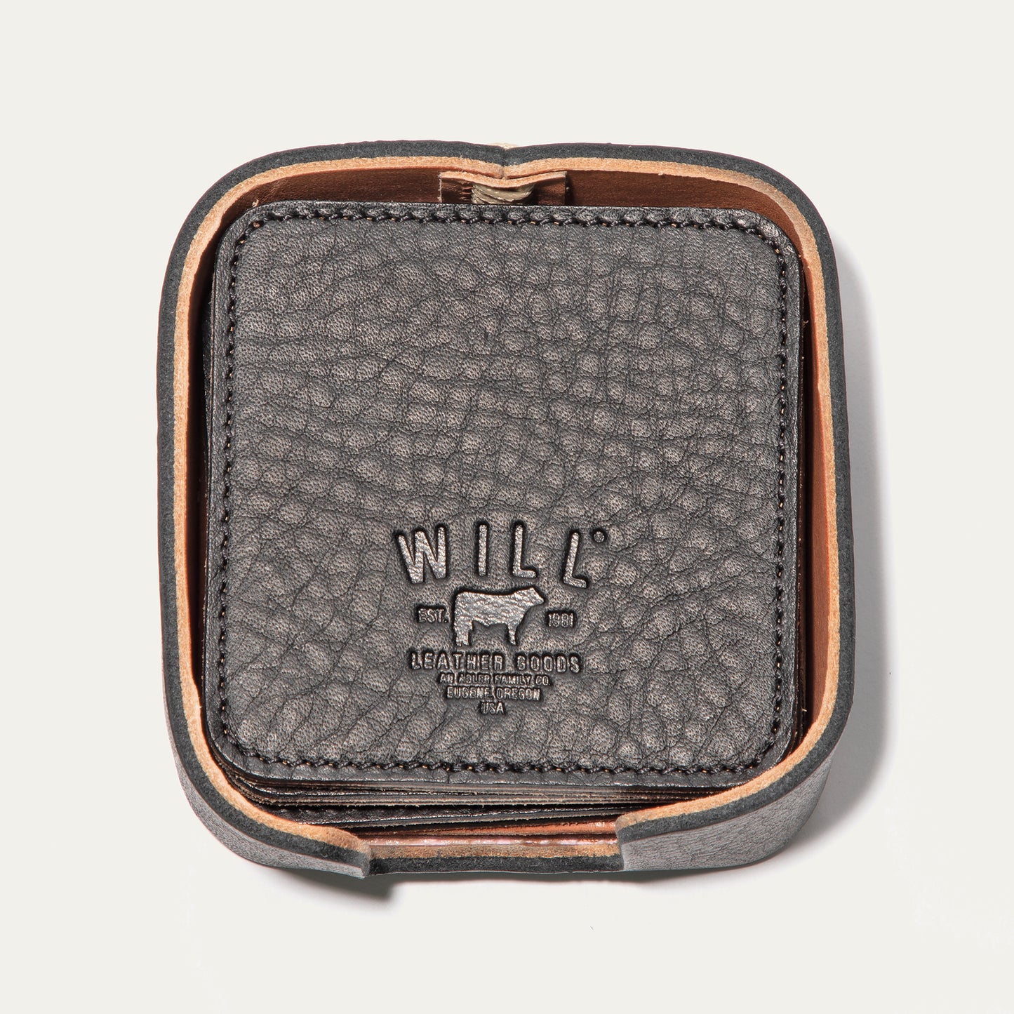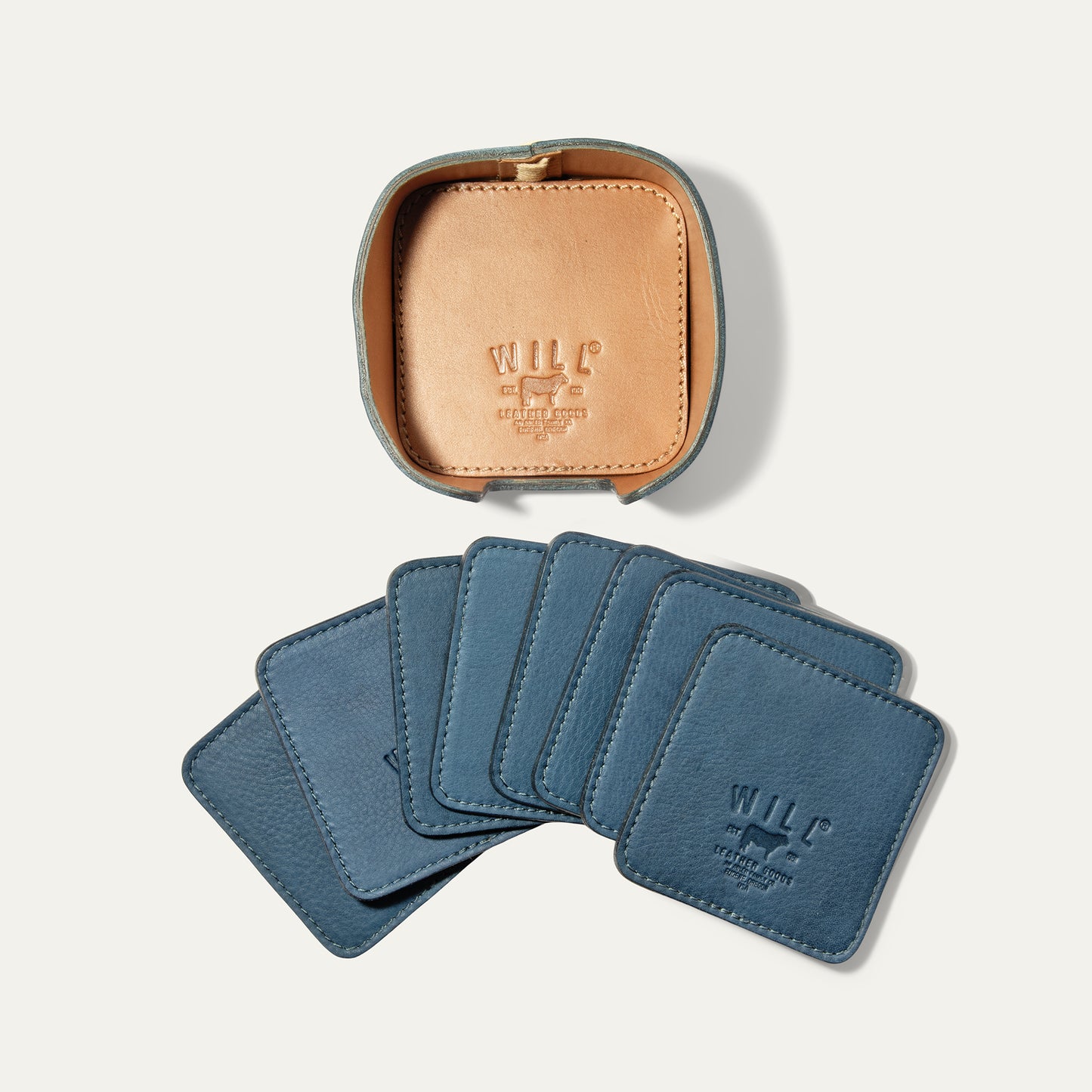 Our Leather Coaster Set is handcrafted from full-grain, vegetable-tanned leather. Eight square leather coasters with rounded corners come in a hand-laced, molded leather holder. Each coaster is debossed with the Will Leather Goods logo and stitched to a natural vachetta leather bottom panel. Hand-burnished edges and heavy-gauge industrial nylon thread to ensure durability. We stand behind our product—guaranteed for life.