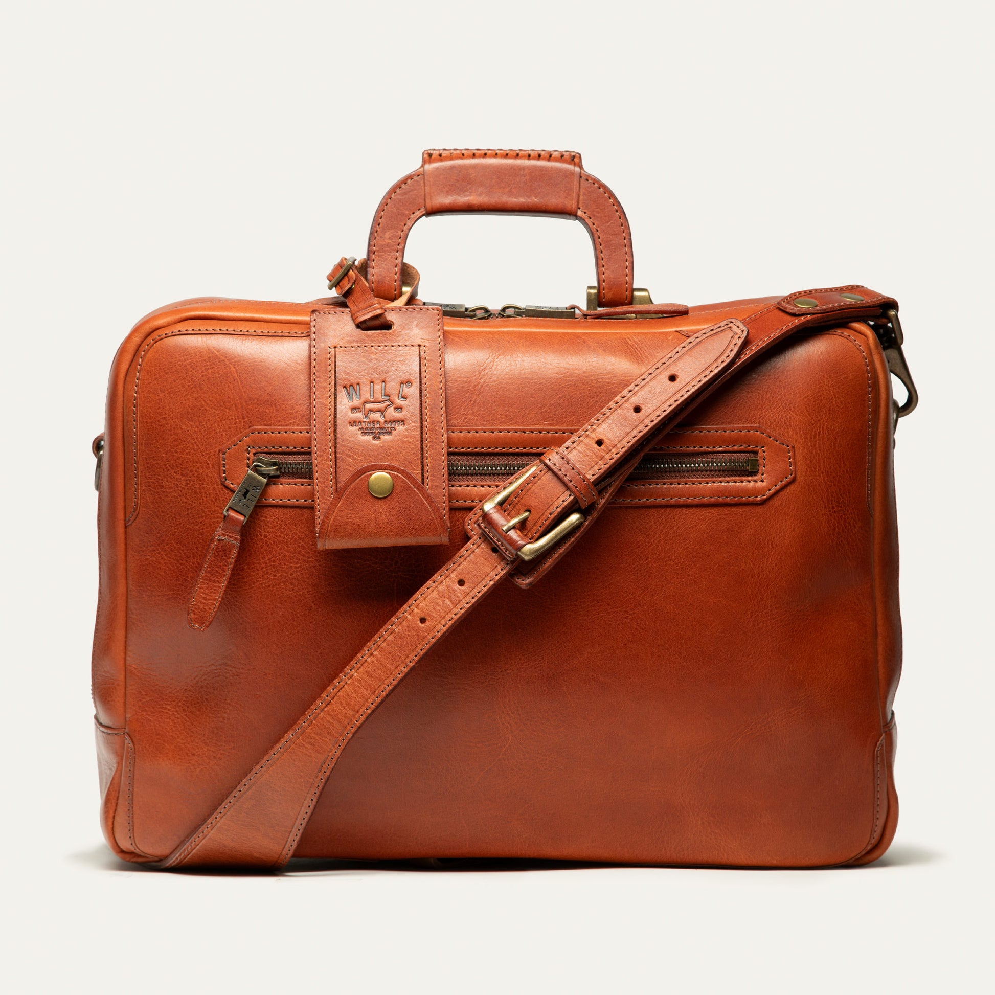 Our William Continental Briefcase is handcrafted with certified full-grain, vegetable-tanned Italian leather. Contents are secured by a smooth-running, brass, made-in-USA UCAN zipper, while the exterior features our William Collection luggage tag so your bag can always be identified. A leather-framed zipper pocket on the exterior front panel of the Continental allows fast access to your phone and other essentials. Carried comfortably in the hand with its gel-padded, stacked leather top handle, or on the shoulder or across the torso with the detachable, adjustable crossbody strap. The central compartment contains a padded laptop/tablet sleeve, phone pocket, eyeglass pocket, two dedicated pen loops, and a solid brass key ring. Solid brass hardware, industrial-grade nylon thread, and leather corner reinforcements ensure the Continental Briefcase is built to last a lifetime. We stand behind our product—guaranteed for life.