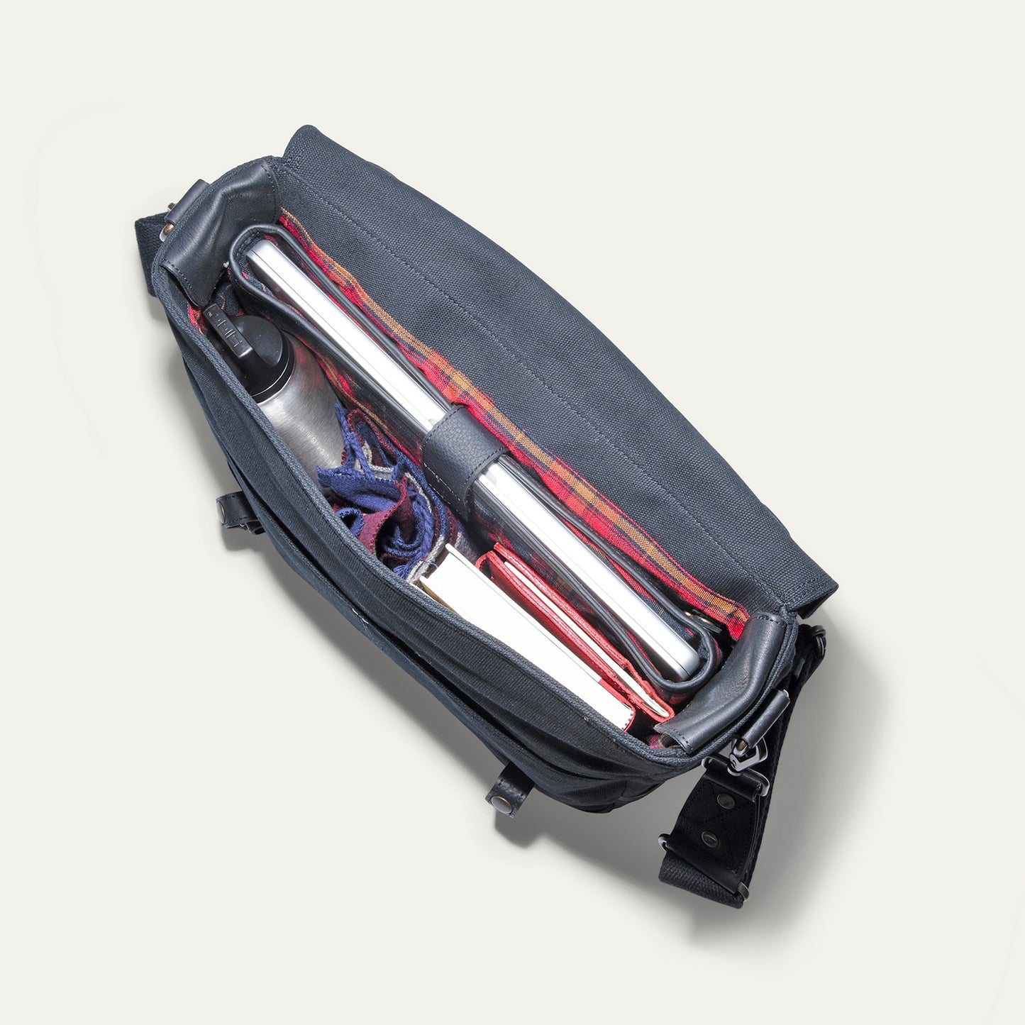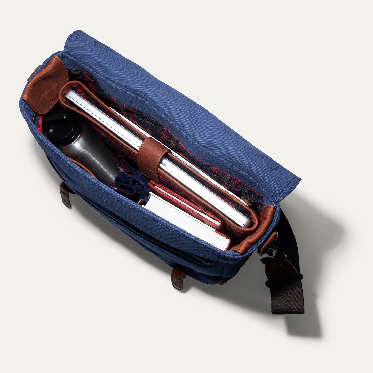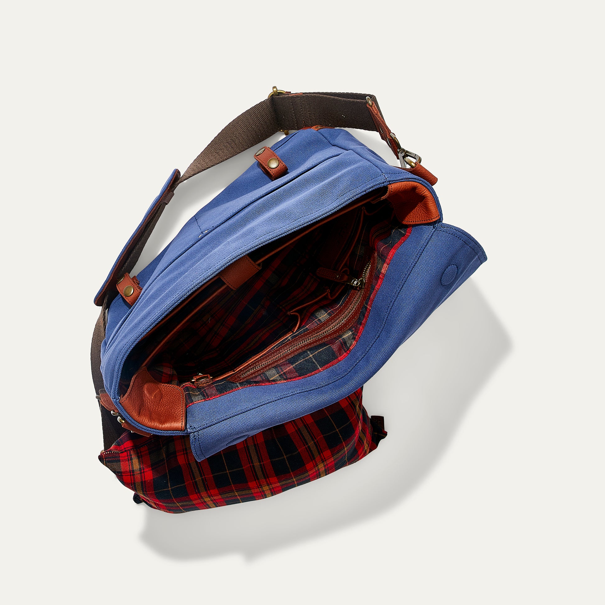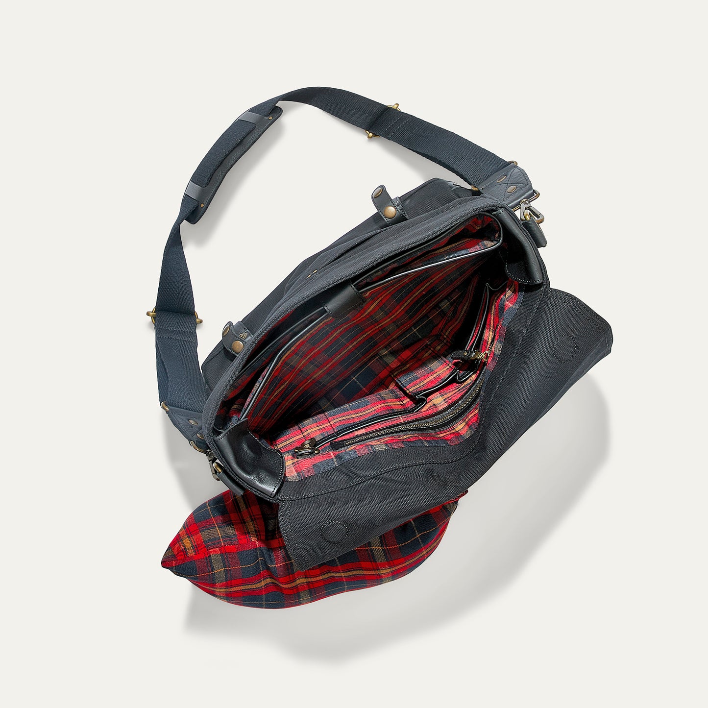 The Wallace Messenger Bag is handcrafted with industrial-grade 18-ounce 100% cotton canvas and full-grain, vegetable-tanned leather. Our skilled artisans take 139 steps from the first cut of the leather to the final hand-hammered rivet to ensure our Travel Duffle lasts a lifetime—we guarantee it. Double-reinforced box stitching, dual hand-hammered steel rivets, and a leather-wrapped top handle allow you to carry your Wallace by hand. Our detachable and adjustable industrial-grade cotton webbing strap with removable memory foam pad can be slung on the shoulder or across your torso. A convenient hidden trolley sleeve allows you to securely place your Wallace Messenger on top of a rolling suitcase. Under the leather flap, two exterior slip pockets allow easy access, while a large back zipper pocket will hold your additional belongings. Hidden rain flaps ensure your personal items are protected from inclement weather. Lined in our signature plaid, the interior features extensive organization—including a roomy zipper pocket, three slip pockets, a business card slot, an antique brass key clip, and a padded laptop sleeve. We stand behind our product—guaranteed for life.